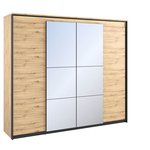 Det rummelige garderobe fra QUANT-kollektionen er en ideel løsning for folk, der værdsætter funktionalitet. Denne garderobe har to stænger, hvorpå du kan hænge tøj i forskellige længder og et stort antal hylder. Soveværelsesgarderobeskabet i loftstil er kendetegnet ved en interessant kombination af trefarvet indretning med en sort ramme, der fungerer som støtte. Ved at placere et stort spejl på en af fronterne forstørrer det rummet optisk og gør det mere rummeligt. Sættet indeholder en fire-dørs garderobe med hængslede døre og en to-dørs garderobe med skydedøre. Hvis du har brug for mere opbevaringsplads, indeholder sættet en kommode med tre skuffer, der gør det nemmere at organisere dokumenter eller andre småting. Indbygget LED-belysning understreger møblernes moderne karakter.