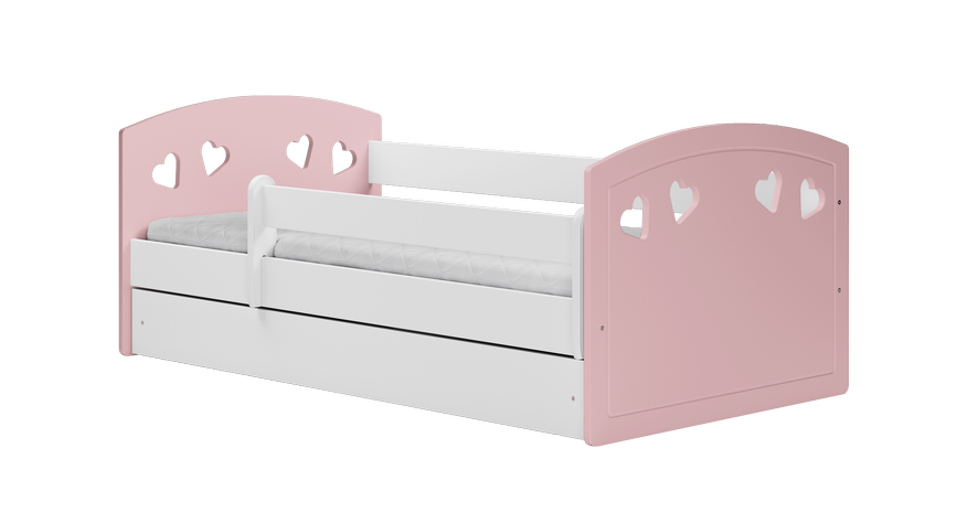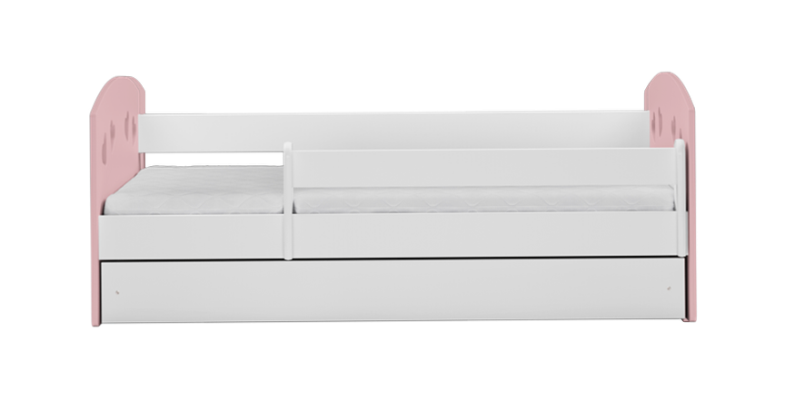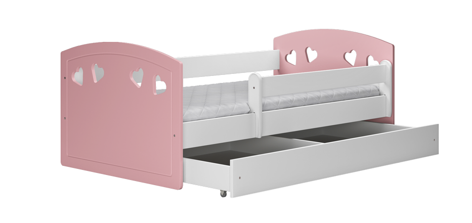JULIETTA sengen er en smuk, hvid og lyserød seng til et børneværelse, lavet af materialer af høj kvalitet. Den udbudte seng er i størrelsen 140x80. Den præsenterede seng er et møbel designet med sikkerheden for de yngste brugere i tankerne, derfor er panelernes kanter afrundede. Sengen har en struktur lavet af lamineret møbelplade med en tykkelse på 18mm, og fronterne i sengen er lavet af MDF-plade lakeret tre gange med økologiske og certificerede malinger. Sengen til børn er samlet ved hjælp af specielle spændingsbolte, takket være hvilke den kan modstå en belastning på op til 100 kg. Dette gør det muligt for forælderen at lægge sig ned ved siden af barnet for at hjælpe dem med at falde i søvn. Sengen er dobbeltsidet - det betyder, at vi på montagestadiet kan vælge, hvilken side der skal udstyres med gelænder og valgfri skuffe.