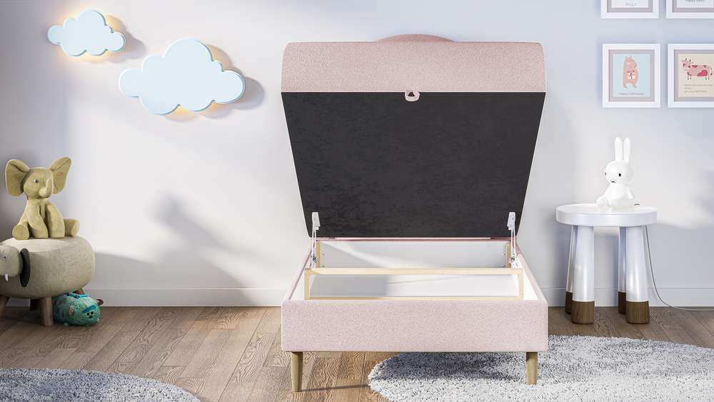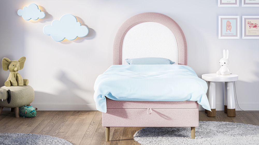 BELUCI børneseng er et smukt polstret møbel, som vil passe perfekt ind i mange moderigtige og moderne arrangementer. Den imponerer med sin originale, polstrede afrundede sengegavl, som ikke kun giver elegance, men også giver enestående komfort, mens du slapper af eller læser bøger hver dag, inden du går i seng. Sengerammen, lavet af træ og beklædt med stof af højeste kvalitet, er et perfekt supplement til møblernes moderne design. Dens elegante finish og omhyggelige detaljer gør det ikke kun til et møbel til at sove i, men også et dekorativt element, der giver rummet en unik karakter. Baloo-stoffet har en meget interessant vævning, det ligner en kombination af flere løkker. Takket være dette ser det meget elegant og originalt ud og er ekstremt holdbart. Dens afdæmpede, elegante form er perfekt til både moderne arrangementer og mere klassiske stilarter. Sengen er udstyret med en komfortabel bonnell madras, som garanterer en sund og behagelig søvn for dit barn. Deres enestående fleksibilitet og holdbarhed betyder, at de giver optimal støtte til kroppen under søvn. Det hele hviler på elegante træben, som ikke kun holder sengen stabil, men også giver den lethed og sofistikeret.