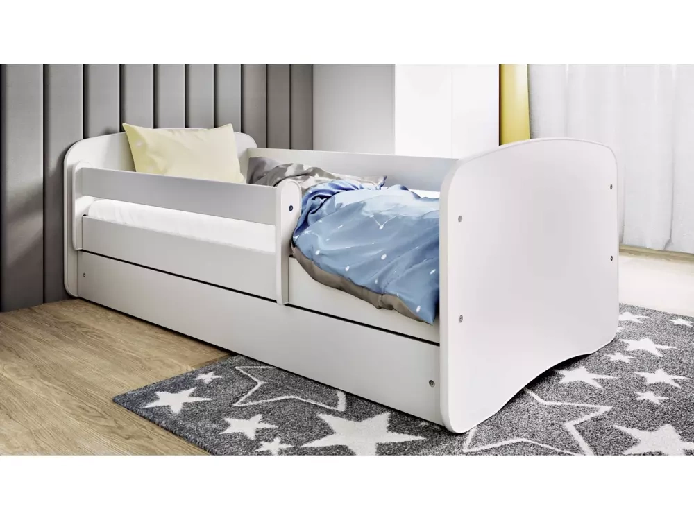 Seng BABY DREAMS hvid kommer med et stel med elastiske trælameller og en 100 cm lang skinne, der frit kan bevæges langs sengerammen, og endda helt fjernes. Når du køber en seng med skinner, kan vi være sikre på, at vores barn ikke ved et uheld falder ned af sengen, mens han sover. Tremmesengen sælges med madras og skuffe. Ved at vælge en seng med skuffe får vi ekstra opbevaringsplads til sengetøj eller andre ting. Skuffen er todelt og udstyret med gummihjul for at gøre det nemmere at fjerne den fra under sengen.