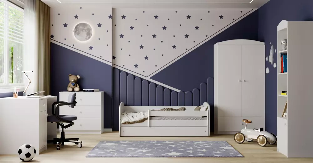 BABY DREAMS hvid seng er en tremmeseng designet til at sikre sikkerheden for små brugere. Allerede på designstadiet blev alle skarpe kanter elimineret og erstattet med afrundede. Derudover har fronterne en gummiprofil, der beskytter mod smertefulde stød, mens børn sover eller leger på sengen. Sengen er lavet af 18 mm tyk lamineret møbelplade. Til montering af sengen er der fastgjort specielle strammeskruer, takket være hvilke sengens maksimale belastningsevne er 100 kg. Da sengen er dobbeltsidet, kan du vælge side af det aftagelige gelænder og skuffe under monteringen.