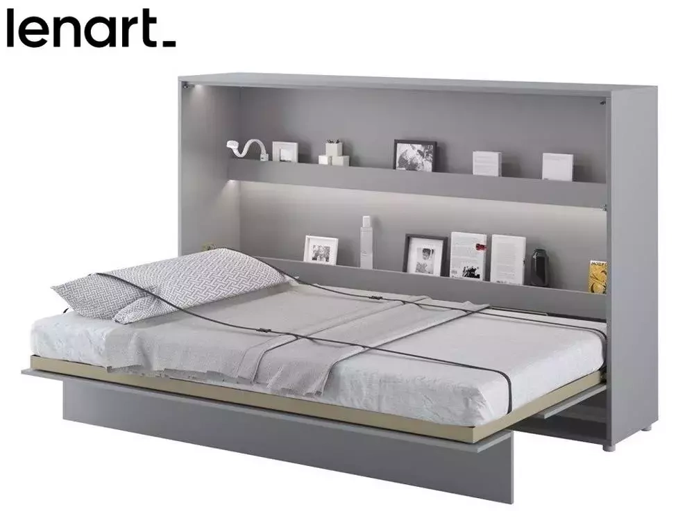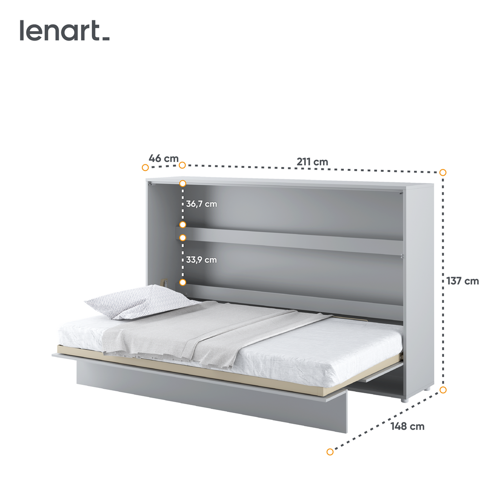 Den moderne BED CONCEPT skabseng er en innovativ idé til at indrette rum med mindre arealer. Denne type møbler blev skabt til funktionel udnyttelse af rummet i hjemmet, og tilbyder et unikt design og behagelig brug. Takket være den sikre mekanisme og pneumatiske støtte kan du forvandle ethvert rum til et behageligt soveværelse med en håndbevægelse, og efter brug kan du nemt skjule sengen, så den ikke optager unødvendig plads. Praktiske hylder med LED-belysning giver mulighed for at opbevare de nødvendige ting lige ved hånden, samtidig med at de ser yderst interessante og fænomenale ud. Dine yndlingsbøger, familiesouvenirs eller dekorationer vil finde et sted, hvor de vil blive vist korrekt. En ekstra LED-lysmulighed med USB-udgang er en rigtig godbid for folk, der kan lide at læse ved sengetid. LED-lys købes separat. Komfortabel, stabil konstruktion gør brugen af BED CONCEPT skabssengen til en sand fornøjelse, hvilket resulterer i tilfredsstillelsen af et perfekt indrettet rum. Vægsengen kan også beriges med udtræk, LED-belysning, lamper eller en madras!