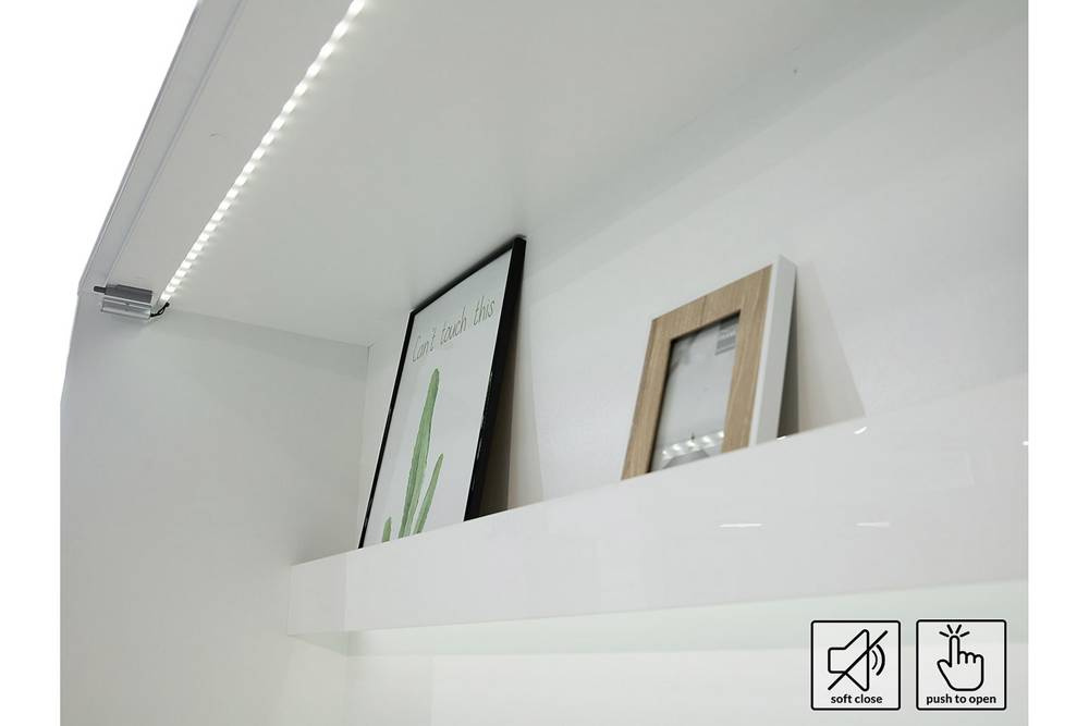 Møblerne er kendetegnet ved en massiv struktur baseret på en skadesbestandig møbelplade. Stabilitet genererer en metalramme og trinramme som standard, ansvarlig for komforten i en traditionel seng. Støjsvag lukning, praktiske bogreoler, stropper, der sikrer sengetøj er blot nogle af fordelene ved en garderobeseng. Valgfri LED-belysning fuldender helheden, hvilket gør, at tilbuddet skiller sig ud fra resten. Den induktive berøringskontakt med lysdæmper vil helt sikkert leve op til dine forventninger.