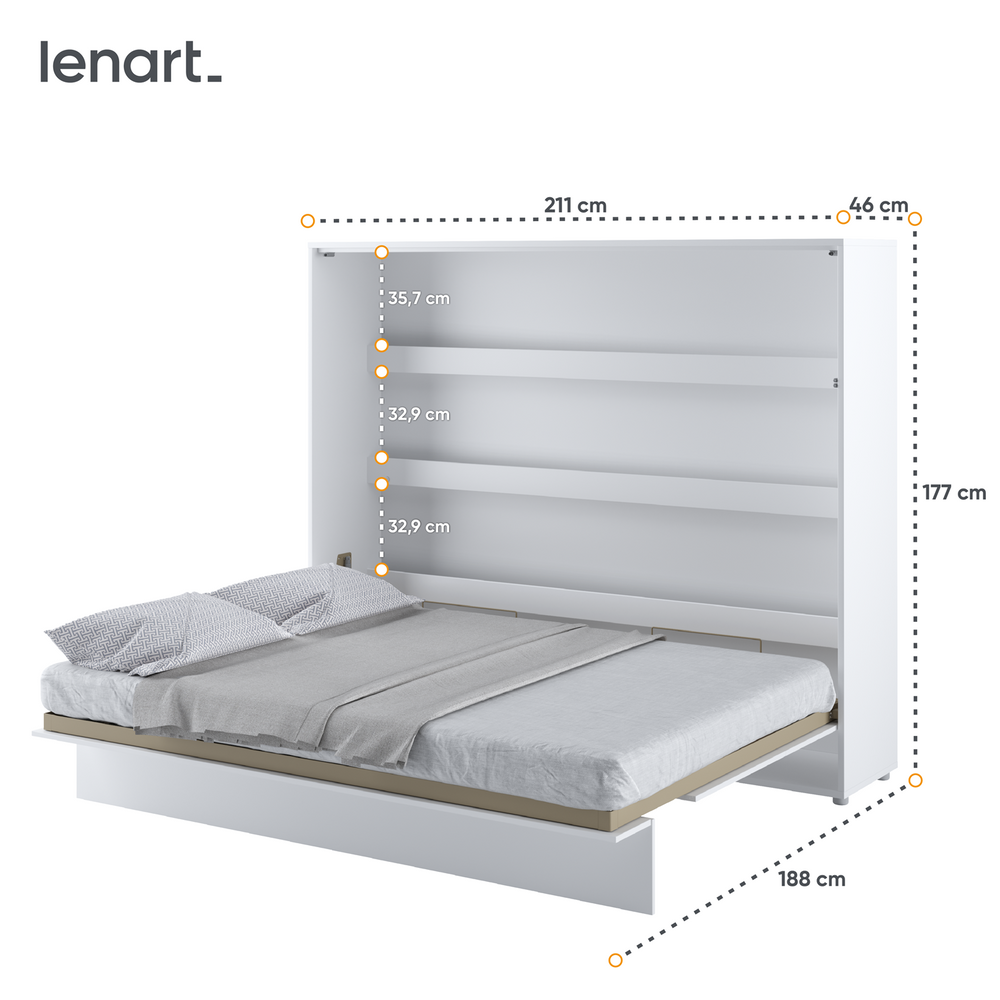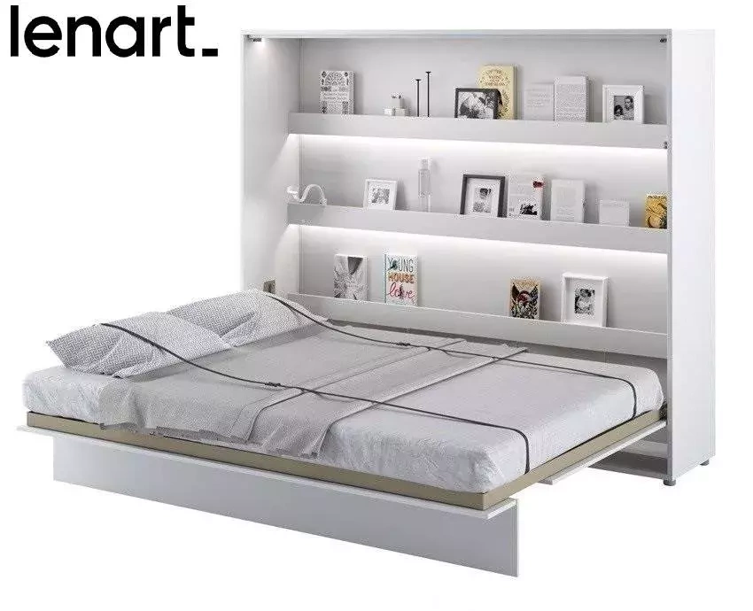 Den moderne BED CONCEPT skabseng er en innovativ idé til at indrette rum med mindre arealer. Denne type møbler blev skabt til funktionel udnyttelse af rummet i hjemmet, og tilbyder et unikt design og behagelig brug. Takket være den sikre mekanisme og pneumatiske støtte kan du forvandle ethvert rum til et behageligt soveværelse med en håndbevægelse, og efter brug kan du nemt skjule sengen, så den ikke optager unødvendig plads. Praktiske hylder med LED-belysning giver mulighed for at opbevare de nødvendige ting lige ved hånden, samtidig med at de ser yderst interessante og fænomenale ud. Dine yndlingsbøger, familiesouvenirs eller dekorationer vil finde et sted, hvor de vil blive vist korrekt. En ekstra LED-lysmulighed med USB-udgang er en rigtig godbid for folk, der kan lide at læse ved sengetid. LED-lys købes separat. Komfortabel, stabil konstruktion gør brugen af BED CONCEPT skabssengen til en sand fornøjelse, hvilket resulterer i tilfredsstillelsen af et perfekt indrettet rum. Vægsengen kan også beriges med udtræk, LED-belysning, lamper eller en madras!