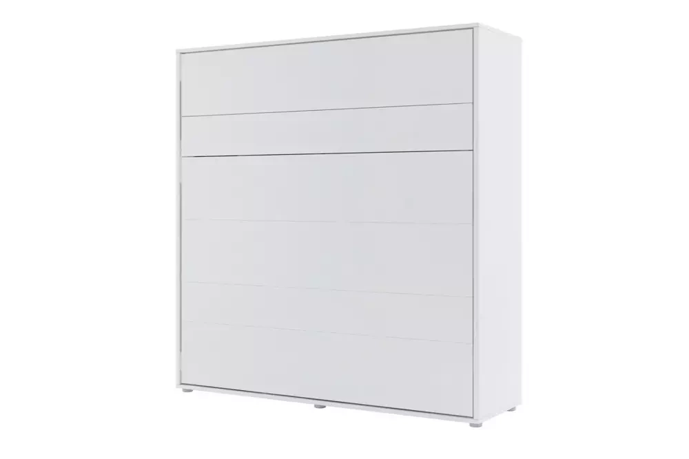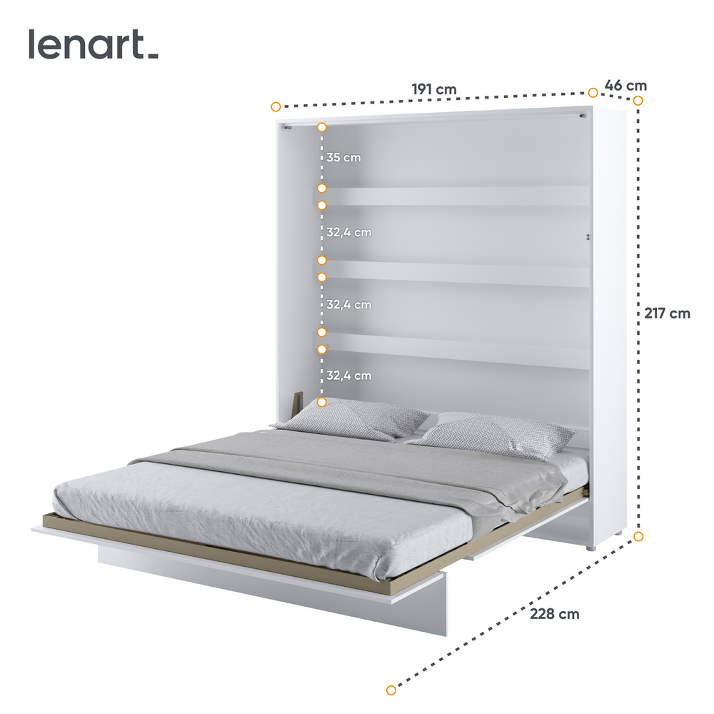 Den moderne BED CONCEPT skabseng er en innovativ idé til at indrette rum med mindre arealer. Denne type møbler blev skabt til funktionel udnyttelse af rummet i hjemmet, og tilbyder et unikt design og behagelig brug. Takket være den sikre mekanisme og pneumatiske støtte kan du forvandle ethvert rum til et behageligt soveværelse med en håndbevægelse, og efter brug kan du nemt skjule sengen, så den ikke optager unødvendig plads. Praktiske hylder med LED-belysning giver mulighed for at opbevare de nødvendige ting lige ved hånden, samtidig med at de ser yderst interessante og fænomenale ud. Dine yndlingsbøger, familiesouvenirs eller dekorationer vil finde et sted, hvor de vil blive vist korrekt. En ekstra LED-lysmulighed med USB-udgang er en rigtig godbid for folk, der kan lide at læse ved sengetid. LED-lys købes separat. Komfortabel, stabil konstruktion gør brugen af BED CONCEPT skabssengen til en sand fornøjelse, hvilket resulterer i tilfredsstillelsen af et perfekt indrettet rum. Vægsengen kan også beriges med udtræk, LED-belysning, lamper eller en madras!