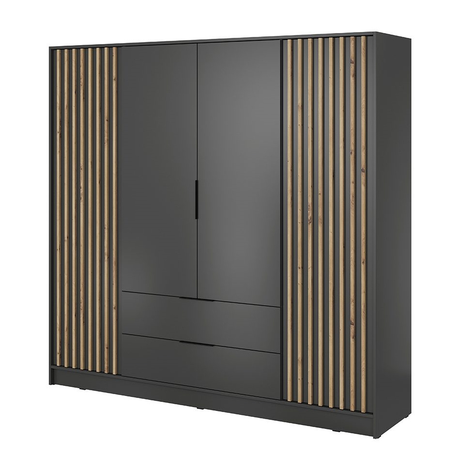 Garderobe Nelly er den perfekte løsning til folk, der værdsætter enkelhed og elegance i ét. Garderobeskabet er perfekt til opbevaring af en række forskellige tøj, også dem der skal hænges op. Det indre af garderoben er opdelt i tre forskellige zoner: den første består af rummelige skuffer og en bar til ophængning af tøj. De næste to zoner består af mange hylder. Nelly garderobeskabet er meget funktionelt og rummeligt. Højden på hylderne er justerbar, hvilket også betyder, at garderoben kan tilpasses endnu mere til vores behov. Håndtag til åbning af sort metal. Den firedørs garderobe Nelly har kroppe og fronter lavet af højkvalitets lamineret plade, der er modstandsdygtig over for snavs og ridser. Derudover er alle kanter beklædt med ABS-kant.