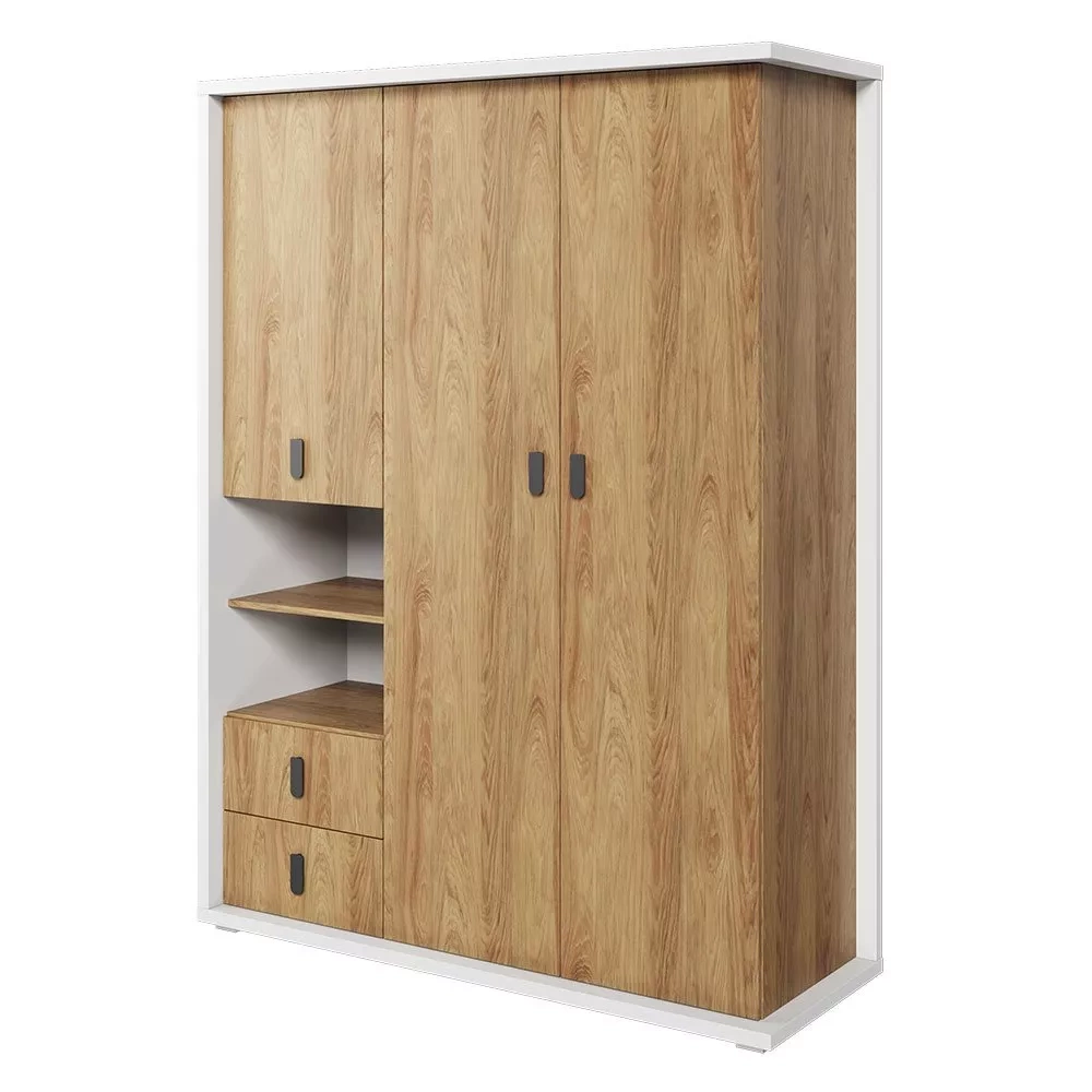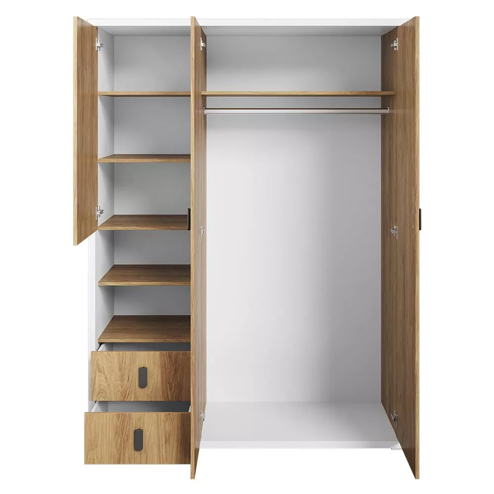 Møblets stil kombinerer modernitet med et strejf af tradition på en interessant måde. Den tidløse kombination af hvid og varm træfarve betyder, at garderobeskabet skaber et hyggeligt arrangement i ethvert interiør. Den moderigtige, massive krop, der samtidig definerer møblens ramme, tiltrækker opmærksomhed. Fronterne blev flyttet tilbage under kropslinjen.