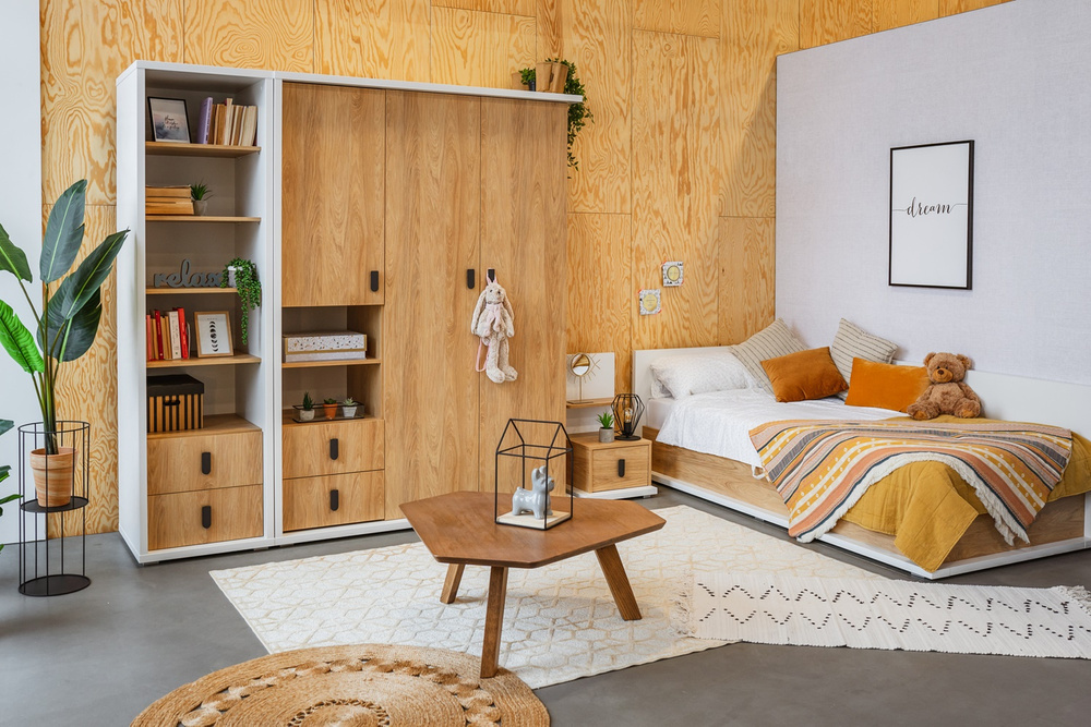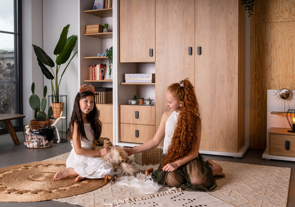 En stor og rummelig garderobe med original indretning. Der finder du en lang tøjskinne, hvor du kan hænge tøj i forskellige længder. Ekstra lagerplads oprettes på hylden over baren og i bunden af garderoben. Møblerne er også udstyret med to skuffer, et aflåseligt skab med tre indvendige hylder og to åbne hylder til bøger eller dekorationer.