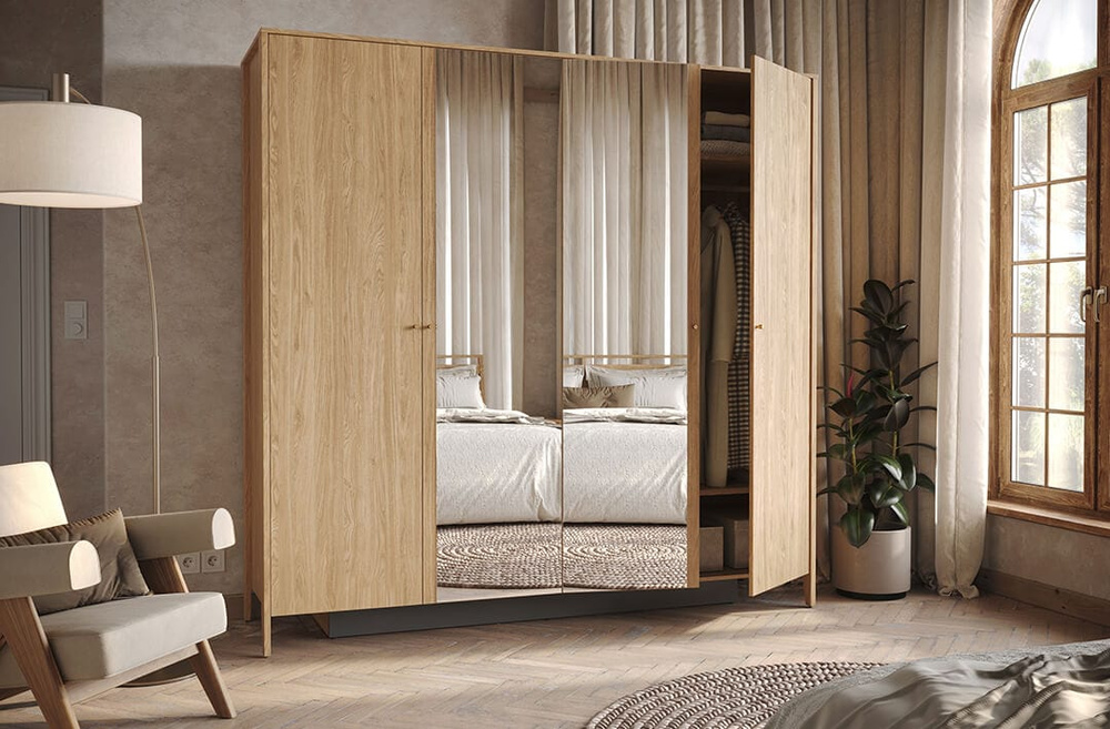 COZY garderobeskabet med spejl henvender sig til folk, der leder efter et praktisk og stilrent møbel. Garderobedesignet er skabt til effektivt at bruge pladsen og samtidig bevare maksimal funktionalitet og originalt design. Hovedelementet i garderoben er et dobbelt spejl på de midterste dørfronter. Dette vil især blive værdsat af folk, der ønsker at se nærmere på deres outfit, inden de forlader huset. En soveværelsesgarderobe med spejl byder på mange praktiske løsninger, der gør det nemmere at organisere tøj og tilbehør. Interiøret er omhyggeligt designet for at udnytte den tilgængelige plads optimalt. Ikke kun lange aftenkjoler og frakker, men også tøj, normalt foldet i terninger, vil finde deres plads i denne garderobe. Solide bøjler giver tilstrækkelig plads til opbevaring af forskellige typer tøj. En fire-dørs garderobe er ikke kun en praktisk løsning til opbevaring af tøj, men også et interessant design, der helt sikkert vil skille sig ud i soveværelset. Garderobefronterne er udført i slidstærkt lamineret plade i egetræsfarve, som giver rummet en både hyggelig og elegant karakter. Dobbeltspejle får rummet til at virke større, og minimalistiske døråbningsgreb passer perfekt ind i fronternes gennemgående finish.