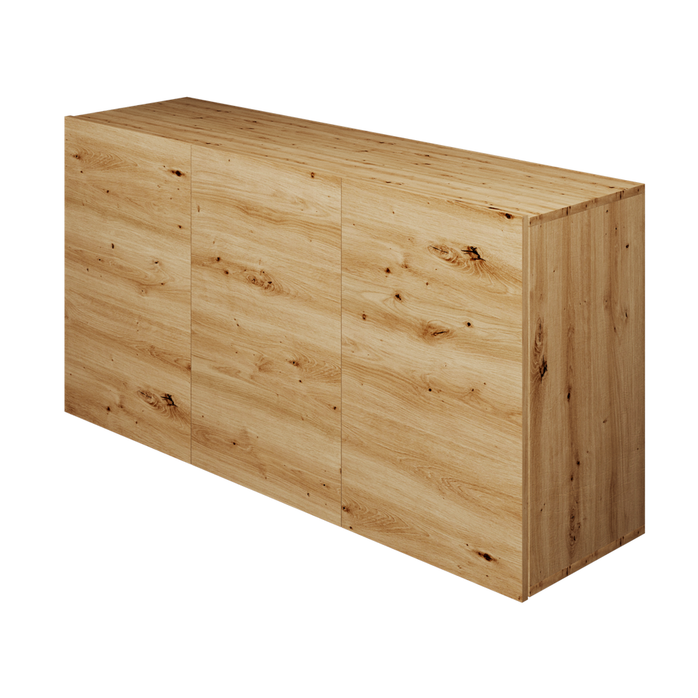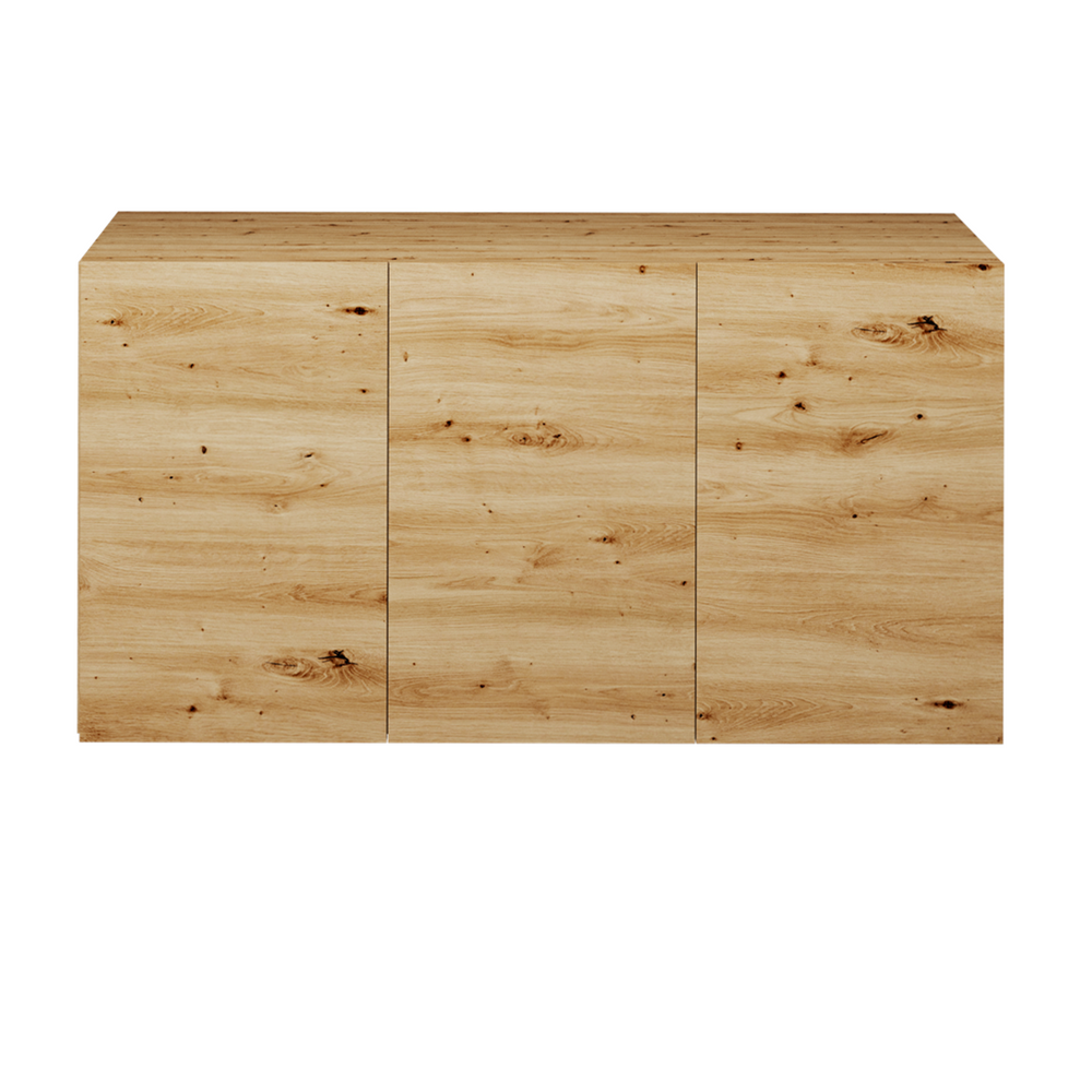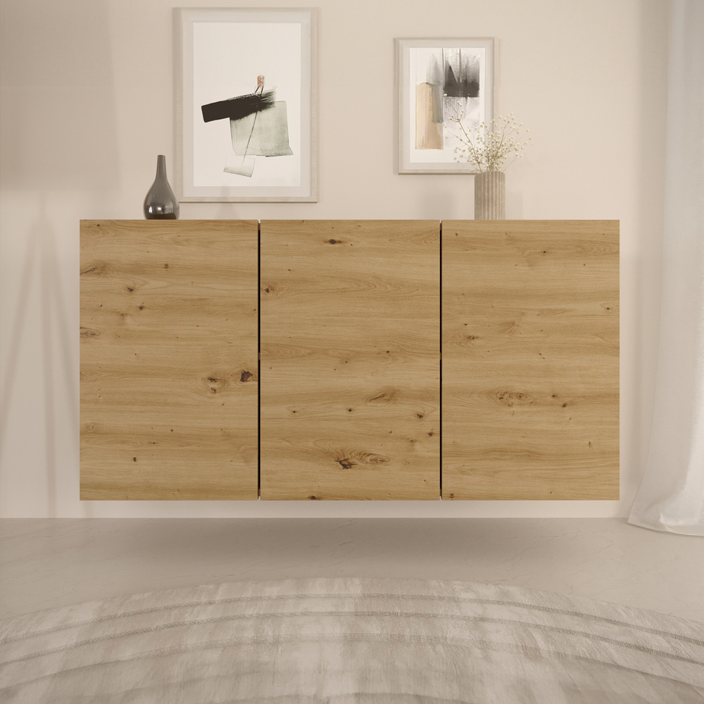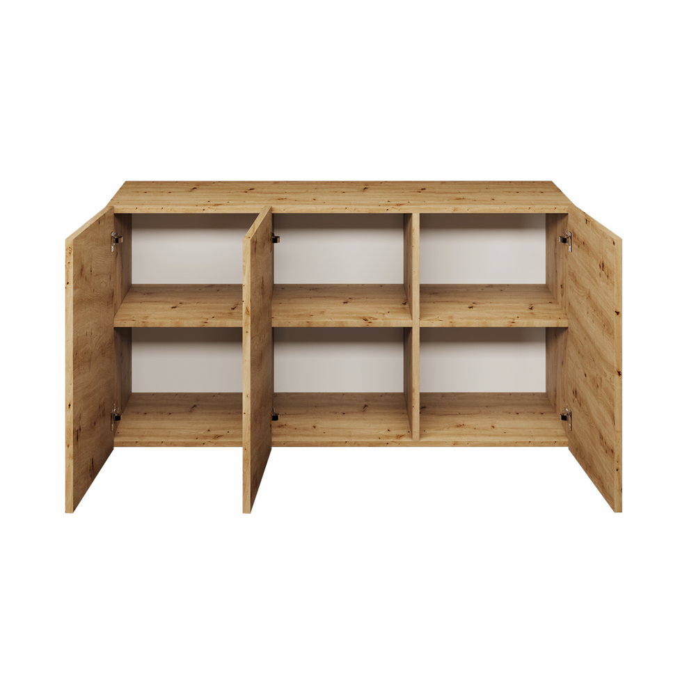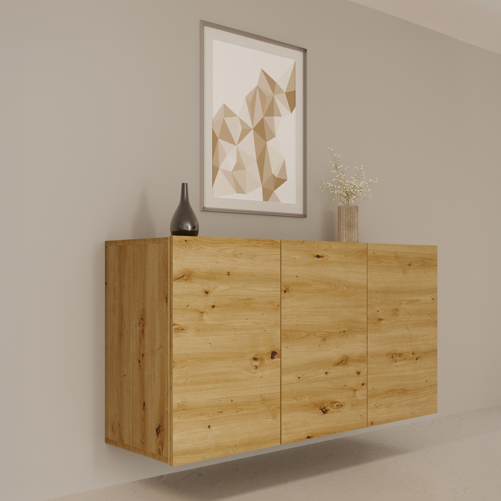 Den store tredørs kommode Dallas er et forslag til folk, der ønsker at slippe af med rod for altid og samtidig have et smukt og interessant interiør. Bag de elegante fronter er der et yderst rummeligt rum med seks rummelige hylder. Dette giver dig god plads til at opbevare forskellige ting, hvilket er med til at holde rummet pænt. Kommoden har plads til dokumenter, en samling af bøger eller film, service til særlige lejligheder, og ved at placere den i hallen får du plads til opbevaring af vintertøj eller sko. Det minimalistiske design får møblerne til at se yderst stilfulde ud, og egner sig ikke kun til stuen, men også til soveværelset, gangen eller gæsteværelset. Den hængende kommode i artisan eg farve tilføjer elegance, som også gør det nemmere at matche den til forskellige arrangementer. At hænge kommoden på væggen sparer ikke kun plads, men gør det også nemmere at holde rent under møblerne. Kommoden er lavet af slidstærk 18 mm tyk lamineret spånplade, og kan monteres på væggen ved hjælp af specielle møbelophæng.