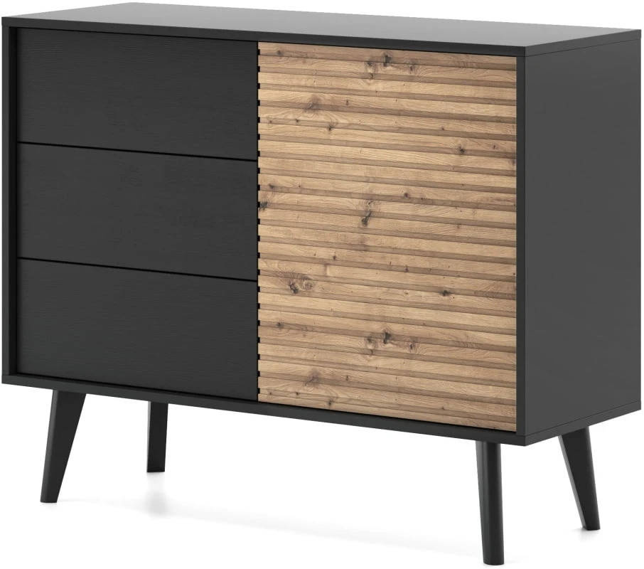 En lille kommode WILLOW vil være en perfekt tilføjelse til din stue, og takket være sin elegante form vil den give interiøret en smagfuld karakter. Møblerne blev lavet til elskere af enkle former. Kommoden vil være det perfekte stykke udstyr til både soveværelset og stuen. Der er mange fordele at lægge mærke til i produktet. Tidløse farver gør dit interiør hyggeligt. Særlig opmærksomhed henledes på den smukke fræsede front. På højre side er der en klap, der åbner til siden, indeni er der en hylde. Du kan arrangere alle dine ting, som du vil. Fordelen ved stuens kommode er smalle og høje ben, lavet af pulverlakeret stål - takket være dem får kroppen ikke kun visuel lethed, men også stabilitet. Produktet vil være et perfekt supplement til interiøret. Møblerne er så høje, at du nemt kan støvsuge gulvet. En lamineret plade af meget høj kvalitet blev brugt i konstruktionen.