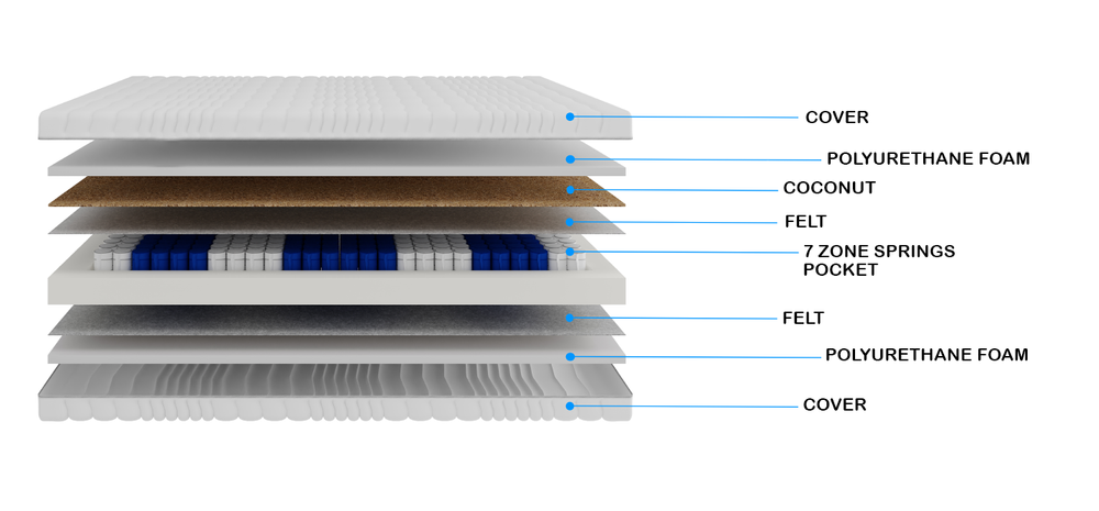 Sammensætning: 2 cm T25 + 1 cm kokos + filt + 12 cm pocketfjedre + filt + 2 cm T25