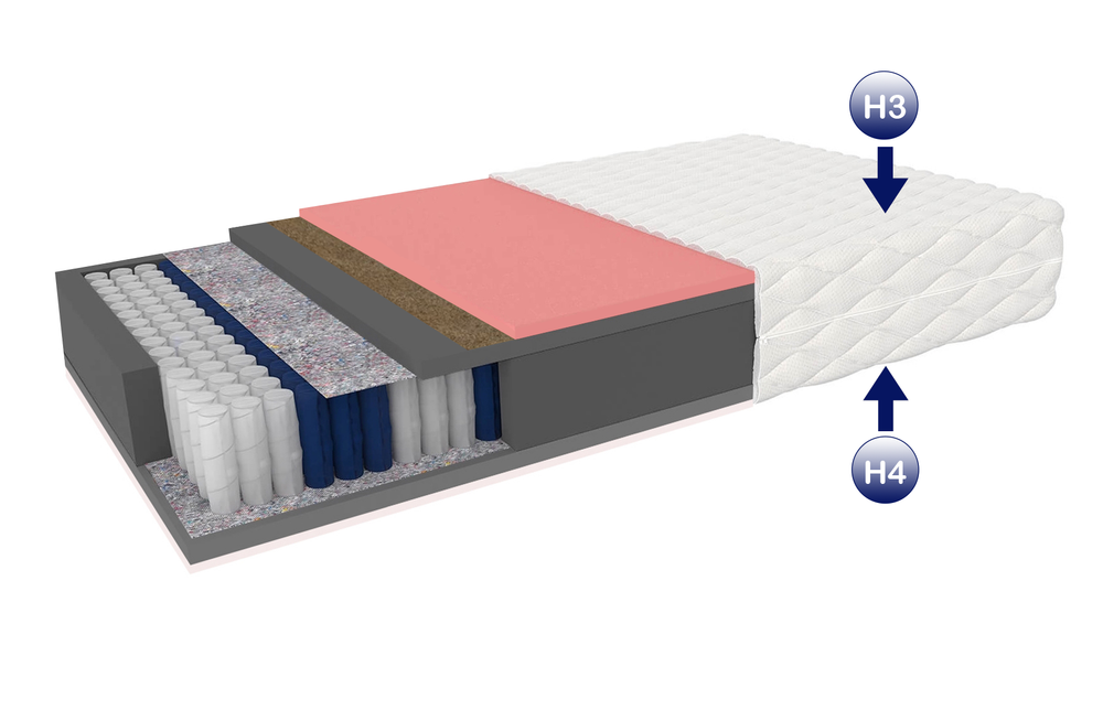 Fasthed: H3 medium fast, H4 fast - det betyder, at madrassen er tosidet, den ene side er fastere end den anden, du kan selv vælge, hvad der er mest behageligt for dig