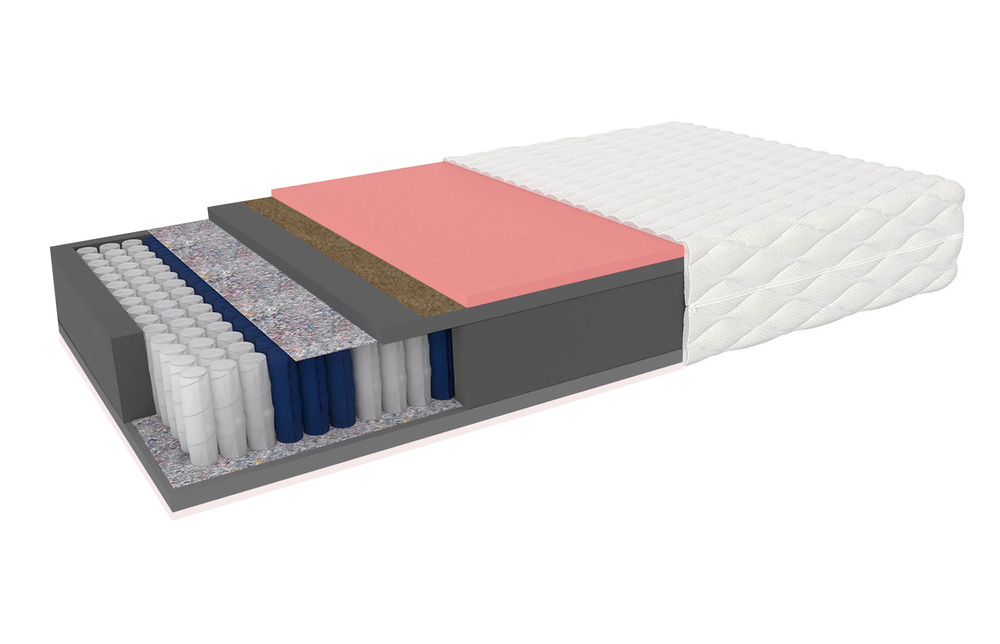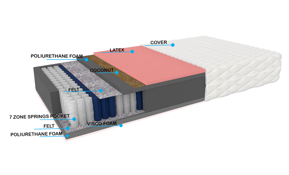 Sammensætning: 2 cm latex + 1 cm kokos + 2 cm polyuretanskum T25 + filt + pocketfjedre 12 cm + filt + 2 cm polyuretanskum T25 + 2 cm visco