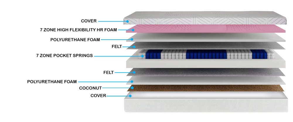 Sammensætning: 3 cm high flexible foam + 2 cm T25 polyurethaneskum + filt + 12 cm pocketfjedre + filt + 2 cm T25 polyurethaneskum + 1 cm kokosnød