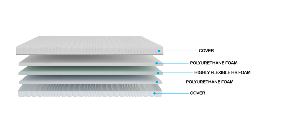 7 zoner HIGH FLEXIBLE FOAM HR - skum med meget høj elasticitet og modstand mod formændring. Den porøse struktur af dette materiale betyder, at skummet perfekt fanger fugt fra madrassen og tillader god luftcirkulation. 7 zoner - 7 forskellige hårdhedsgrader garanterer let tilpasning af produktet til kroppens form og vægt.