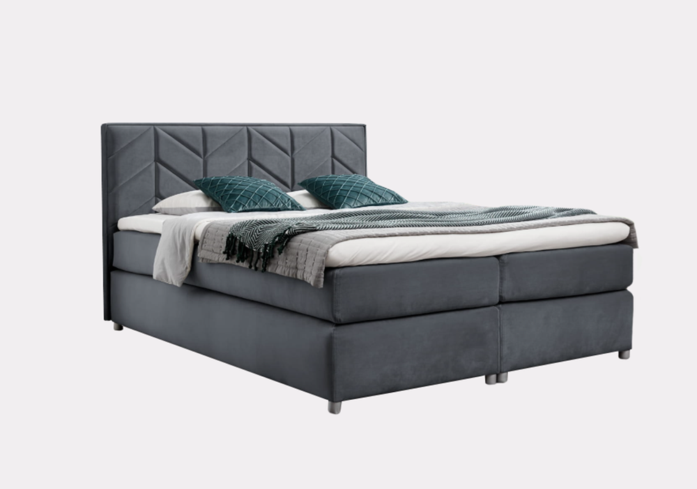 SERINA er en seng i en moderne form, der vil fungere i ethvert moderigtigt interiør. Den polstrede krop beklædt med et blødt velourstof ser smukt ud og vil skabe en varm og hyggelig atmosfære i dit soveværelse. Den høje sengegavl er dekoreret med geometriske sømme, der effektivt vil fange øjet og glæde alle husstandsmedlemmer og gæster. SERINA soveværelsesseng har en lagdelt struktur, der er karakteristisk for kontinentalsenge. Møbler har en stabil boksbund med lommemadras. Topmadrassen består af højelastisk skum, der regulerer temperaturen og reagerer på den mindste bevægelse. Det giver også ekstra elasticitet og blødhed, takket være hvilket det garanterer en fredelig og behagelig søvn. Sengen er ideel til par, for takket være denne konstruktion forstyrrer den ene persons bevægelse ikke den andens søvn. Det hele er baseret på slanke ben i sølvfarve.