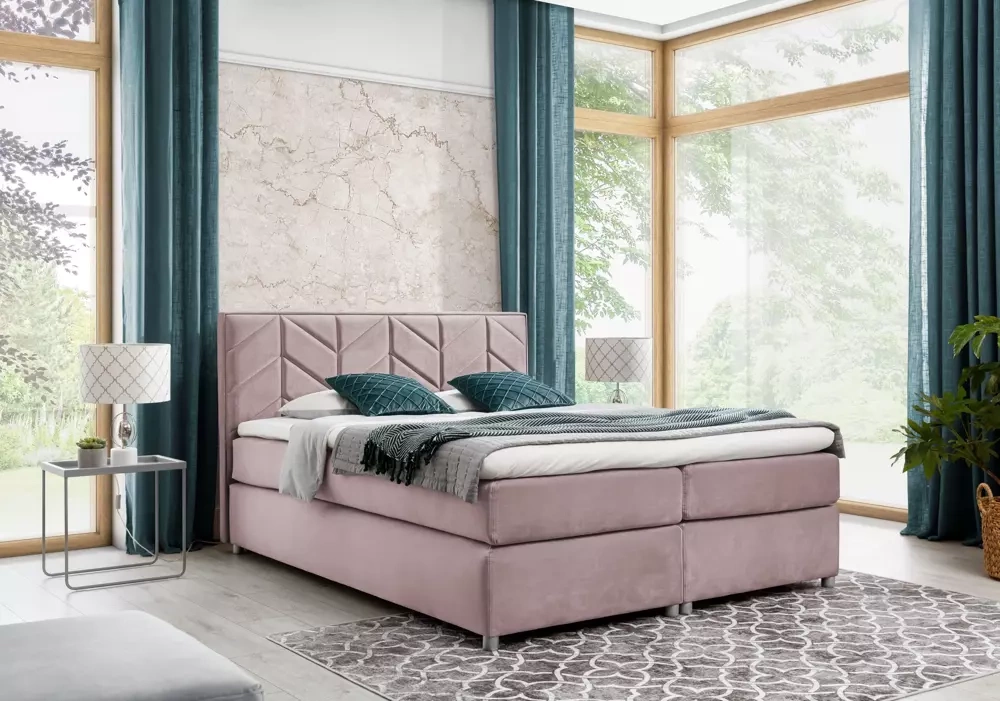 SERINA er en seng i en moderne form, der vil fungere i ethvert moderigtigt interiør. Den polstrede krop beklædt med et blødt velourstof ser smukt ud og vil skabe en varm og hyggelig atmosfære i dit soveværelse. Den høje sengegavl er dekoreret med geometriske sømme, der effektivt vil fange øjet og glæde alle husstandsmedlemmer og gæster. SERINA soveværelsesseng har en lagdelt struktur, der er karakteristisk for kontinentalsenge. Møbler har en stabil boksbund med lommemadras. Topmadrassen består af højelastisk skum, der regulerer temperaturen og reagerer på den mindste bevægelse. Det giver også ekstra elasticitet og blødhed, takket være hvilket det garanterer en fredelig og behagelig søvn. Sengen er ideel til par, for takket være denne konstruktion forstyrrer den ene persons bevægelse ikke den andens søvn. Det hele er baseret på slanke ben i sølvfarve.