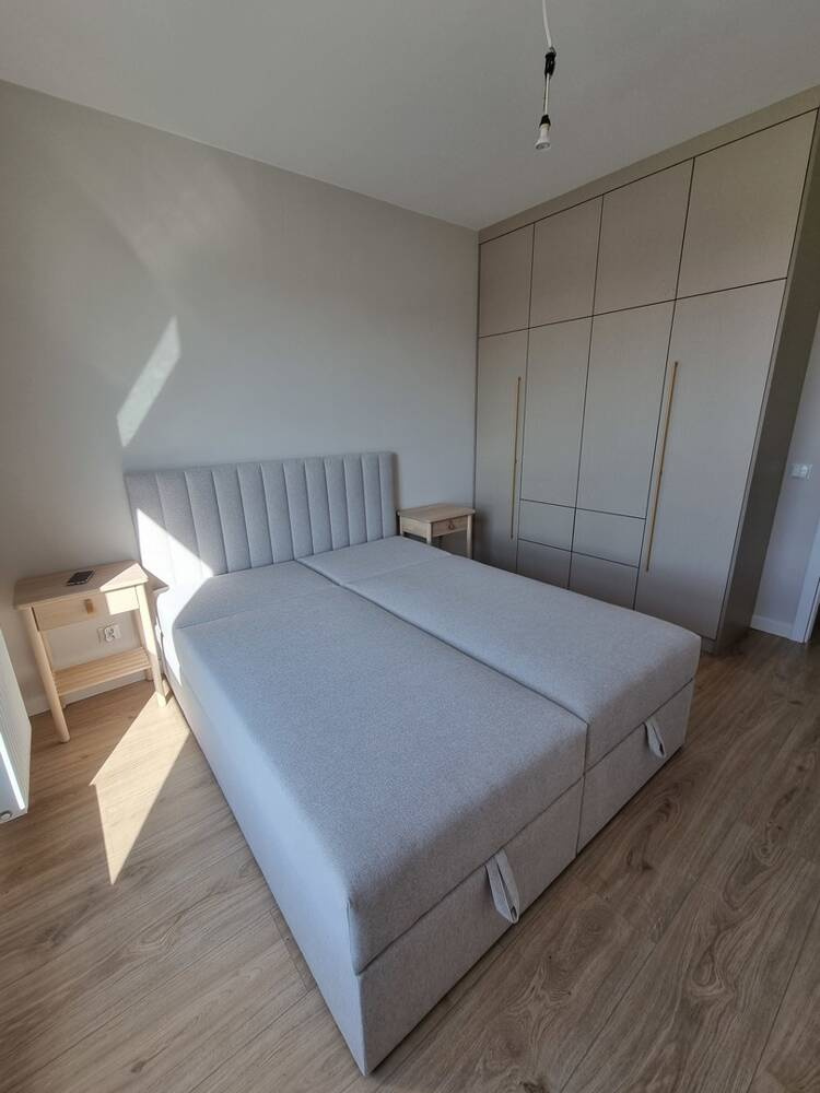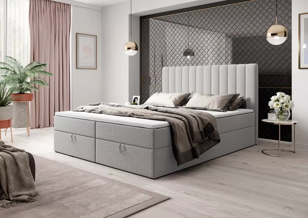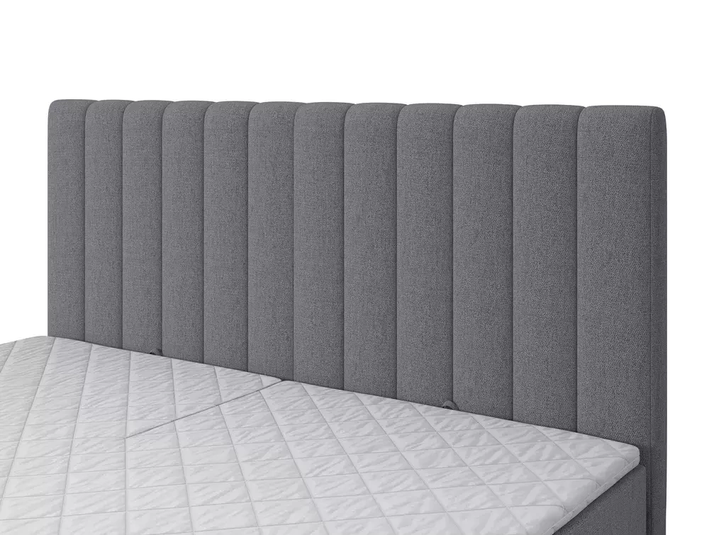 Sengegavlen har dekorative, lodrette sømme, takket være hvilke soveværelset vil have en elegant og moderne atmosfære.
