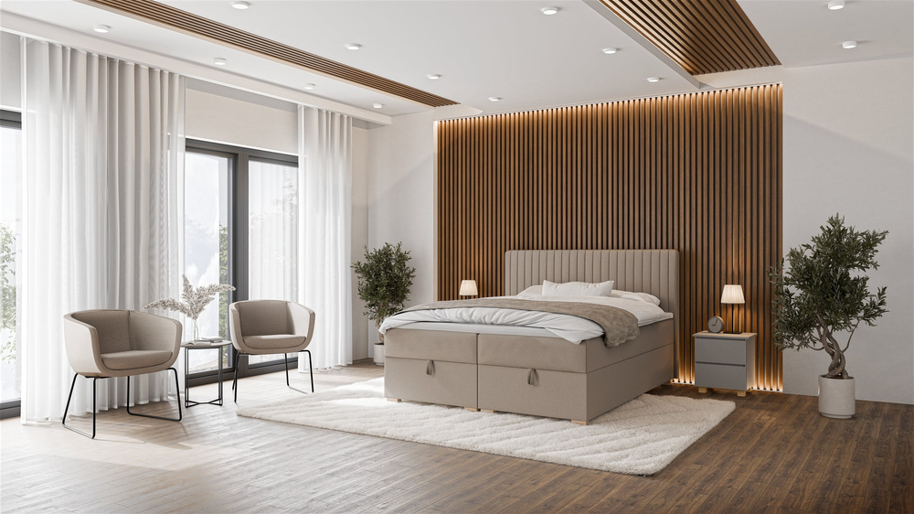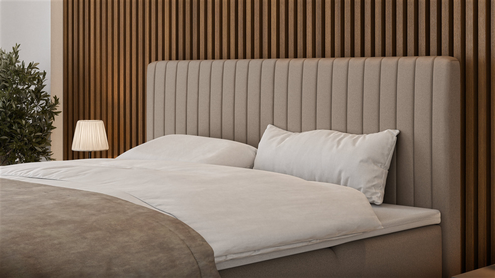 Sengegavlen har dekorative, lodrette sømme, takket være hvilke soveværelset vil have en elegant og moderne atmosfære.