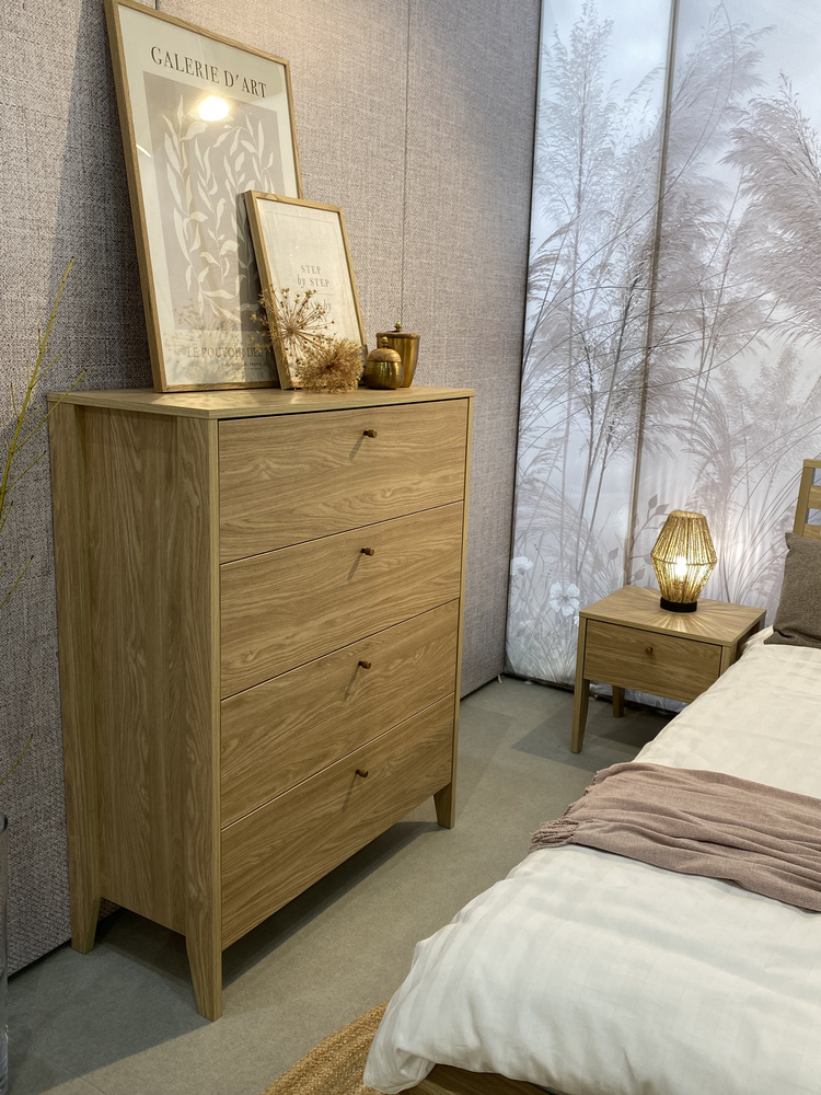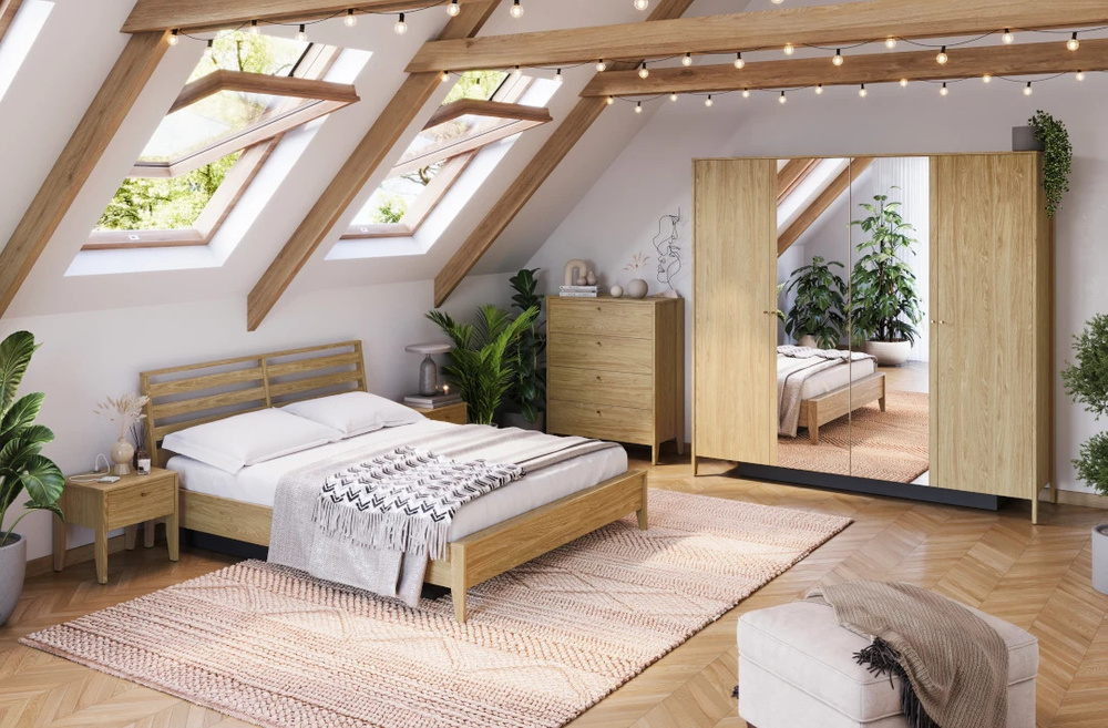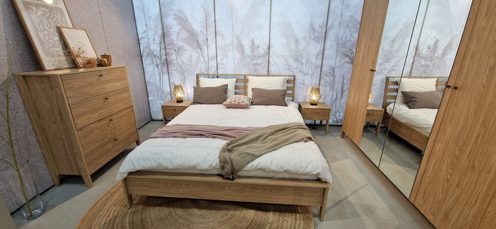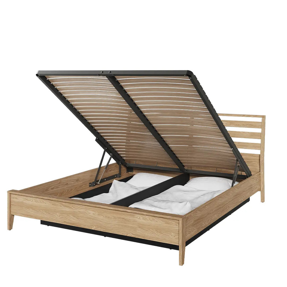 COSY dobbeltsengen er det vigtigste møbel, der skal være i dit soveværelse i skandinavisk stil. Sengen vil give dig en behagelig hvile efter en hård dag på arbejde eller på universitetet. Kombinationen af komfort og et attraktivt image betyder, at møblerne lever op til forventningerne hos de mest krævende kunder. Den er udstyret med en solid metalramme, der garanterer tilstrækkelig støtte til madrassen. Sovearealet er 160x200 cm, så det er perfekt til to personer. En yderligere fordel er et rummeligt opbevaringsrum, hvor du kan opbevare forskellige ting, såsom sæsontøj, sportsudstyr eller ekstra sengetøj eller tæpper. Sengen er lavet af eg lamineret bord, takket være hvilket møbelet vil tjene os i mange år. Sengen er støttet på slanke ben, der tilføjer lethed og elegance til den. Hvert element i møblerne var designet til at sikre en behagelig søvn for alle og var en fryd for øjet med sit udseende.