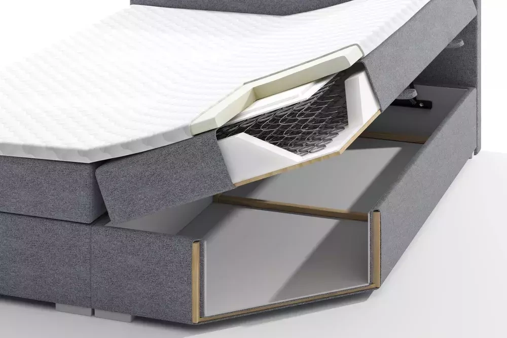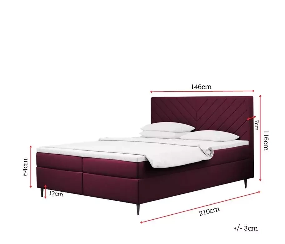 Forventer du mere af dine møbler end blot et flot look? Så vælg den elegante BALTIC kontinentalseng, som mesterligt kombinerer funktionalitet med et smukt udseende! Boksspring BALTIC sengen vil tiltrække din opmærksomhed med sin polstrede ramme og en interessant sengegavl dækket med geometriske syninger. BALTIC soveværelsesengen har en lagdelt struktur, der er karakteristisk for kontinentalsenge. Møblerne har en stabil boksbund, hvorpå der er placeret en bonell madras. Takket være en speciel kombination af bonell-fjedre og T-30-skum vil dette element give dig en fremragende blødhed, samtidig med at det giver tilstrækkelig støtte til de vigtigste punkter i din rygsøjle. Det hele er afsluttet med en behagelig at røre ved overflademadras lavet af T-25 skum, som ikke kun giver ekstra komfort, men også beskytter møblerne mod snavs. Høje, 13 cm, metalben tilføjer lethed og elegance. Derudover giver denne model et sted til praktisk opbevaring af sengetøj, fordi den skjuler to store beholdere.