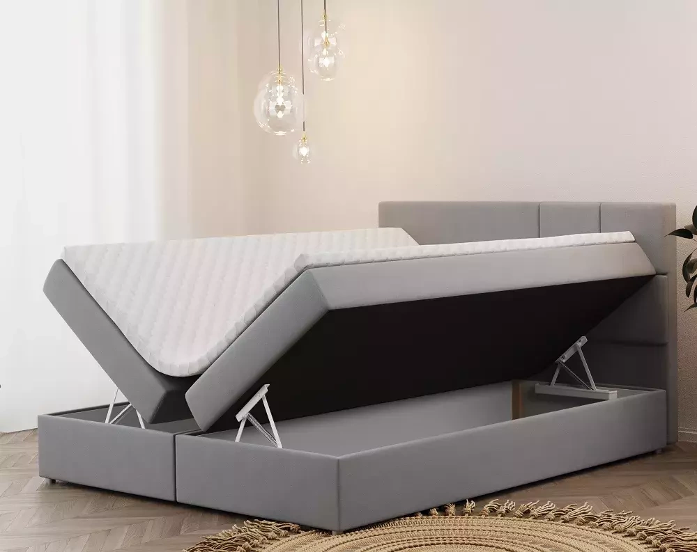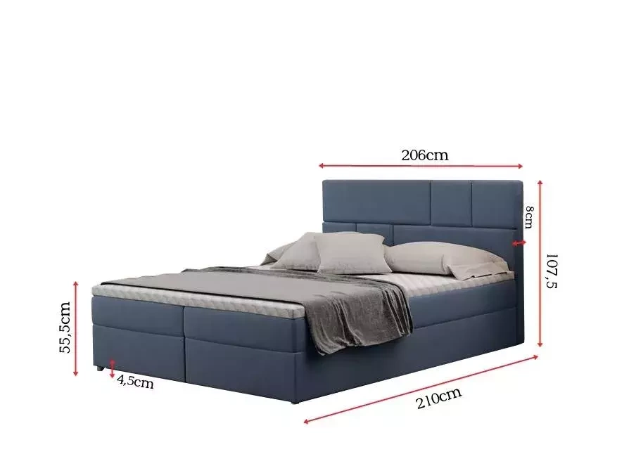 Drømmer du om et komfortabelt og stilrent soveværelse? BERLIN Continental Bed hjælper dig med at nå dette mål! BERLIN boksmadrassen er et forslag lavet til folk, der ønsker at kombinere funktionalitet med den højeste komfort i soveværelset. Den polstrede sengegavl er dekoreret med interessante sømme i geometriske former. BERLIN soveværelsesseng har en lagdelt struktur, der er karakteristisk for kontinentalsenge. Møblerne har en stabil kassebund, hvorpå der er placeret en bonellmadras. Takket være en speciel kombination af bonell-fjedre og T-30-skum vil dette element give dig fremragende blødhed, samtidig med at det giver tilstrækkelig støtte til nøglepunkterne i rygsøjlen. Det hele afsluttes med en behagelig at røre ved overflademadras lavet af T-25 skum, som ikke kun giver ekstra komfort, men også beskytter møblerne mod snavs. Derudover giver denne model et sted til komfortabel opbevaring af sengetøj, men også nødvendigt tøj eller tilbehør, takket være det faktum, at den er udstyret med to store kistebeholdere skjult inde i sengen.