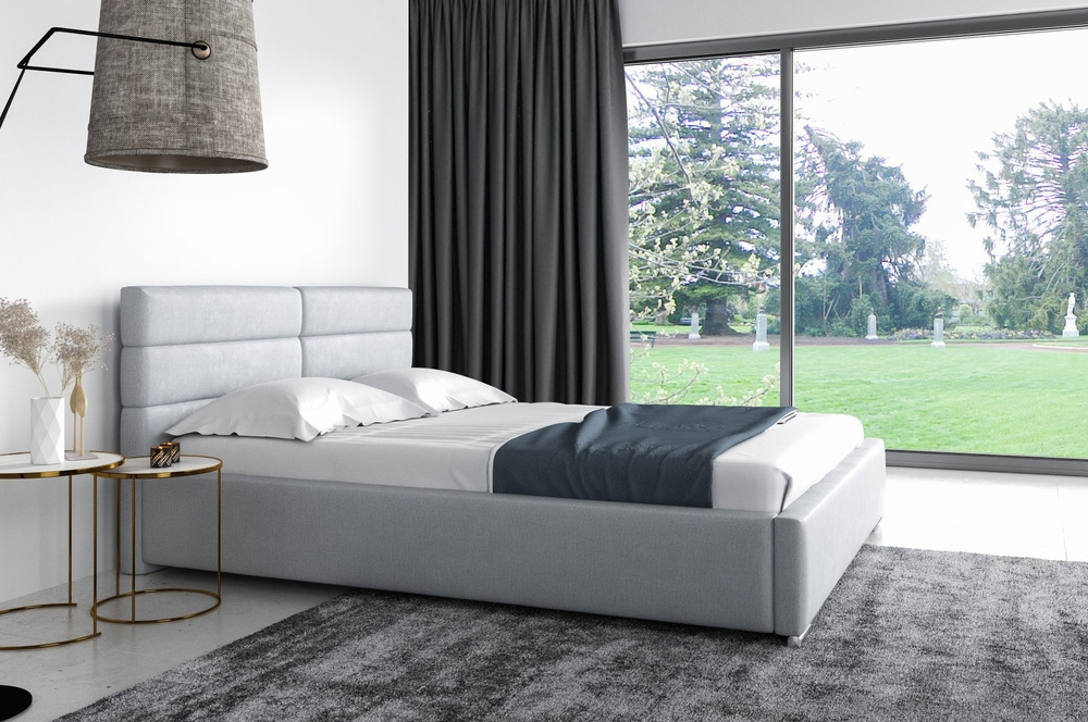 Dette smukke møbel er udstyret med en dekorativ sengegavl med vandrette sømme, som giver indtryk af tidløs elegance. Takket være det vil det være behageligt og bekvemt at se tv eller læse din yndlingsbog. Derudover er en stor fordel ved soveværelsesengen en praktisk beholder til sengetøj, som indeholder alle tekstiler, såsom puder, sengetøj, pudebetræk og håndklæder. Den polstrede seng LORIEN er monteret på solide ben, der giver strukturen den nødvendige stabilitet og sikkerhed ved brug. En behagelig seng er grundlaget for hvert soveværelse, og derfor er denne model udstyret med en metalramme og 34 fjederlameller. Gaslifte brugt i rammen giver dig mulighed for nemt at åbne beholderen til sengetøj. Sengen kan med succes integreres i et moderne soveværelse, hvor den perfekt vil komplementere hele det luksuriøse arrangement.