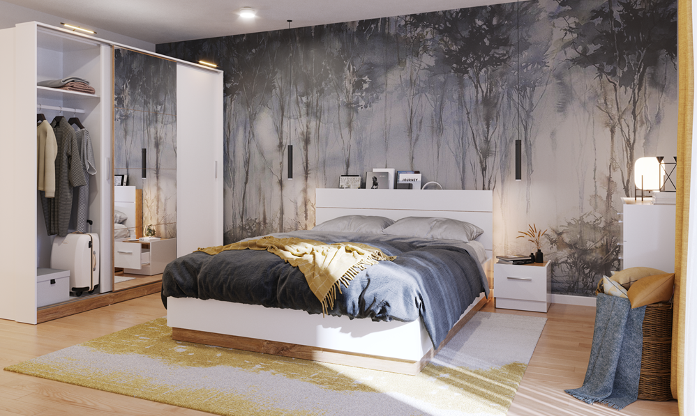 DENTRO sengen er en stor og behagelig seng, der er perfekt til et par. Dens moderne design er hovedsageligt baseret på brugen af klassiske farver, såsom hvid og naturlig træfarve, som giver den et tidløst look. Den største fordel ved denne seng er den høje sengegavl, som har en praktisk hylde. Du kan placere bøger, briller og andre ting, du godt kan lide at have inden for rækkevidde. Det er også et perfekt sted at skjule bærbare eller telefonkabler. En hylde i sengegavlen er en god løsning, især i små soveværelser, fordi den giver dig mulighed for at undvære et natbord, hvilket sparer plads. Nakkestøtten er udstyret med energibesparende LED-belysning, der spreder blødt lys og skaber en magisk atmosfære. Denne løsning vil appellere til folk, der ikke kan lide at sove i fuldstændig mørke. Inde i sengerammen er der et stort opbevaringsrum, hvor du kan opbevare ikke kun sengetøj, men også alle de ting, der ikke passer i skabet, såsom kufferter, tøj til forskellige årstider eller sportstilbehør. Takket være en speciel gasløftemekanisme er det nemt og problemfrit at løfte rammen.