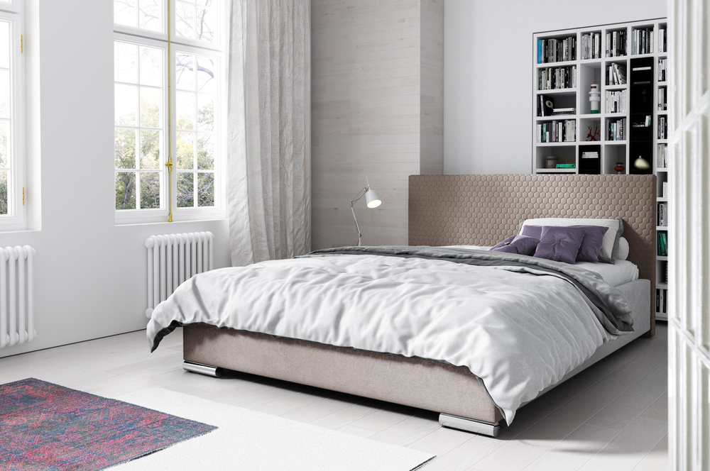 En seng med sengegavl er et forslag til folk, der kan lide at slappe af i en behagelig seng. CAMPO-modellen er udstyret med en dekorativt syet nakkestøtte beklædt med blødt skum. Nakkestøtten fungerer som rygstøtte, men beskytter samtidig væggen. Så tag din yndlingsbog eller tænd for din yndlingsfilm og slap af. Materialet, som sengen er lavet af, er fløjl. Behagelig at røre ved, glat, med en næsten usynlig struktur. Stoffet er slidstærkt og nemt at holde rent.