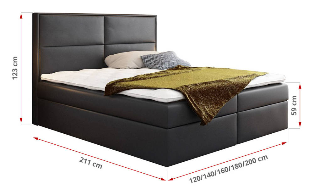 GRAND kontinentalseng vil hjælpe dig med at bringe luksus til dit soveværelse, som indtil nu kun har været kendt fra de bedste femstjernede hoteller! Et så højt komfortniveau vil føre til en væsentlig forbedring af søvnkvaliteten, så du endelig kan hvile ordentligt. Denne stilfulde model har en høj, stilfuld sengegavl, der giver dig mulighed for at tage en behagelig stilling, mens du bruger din smartphone, bærbare computer eller læser din yndlingsbog. Seng med sengegavl imponerer med sit elegante, stilfulde design, der hjælper den effektivt med at oplive dit arrangement. Møbler har en solid ramme med 2 beholdere til sengetøj. En fredelig og sund søvn vil blive sikret af en bonell madras, kendetegnet ved høj holdbarhed og solid konstruktion. Disse elementer gør overfladen af produktet både blød nok til, at du kan ligge behageligt og hårdt nok, takket være det vil det hjælpe dig med at bevare den korrekte kropsholdning, mens du hviler. Sengen i sættet har en 5 cm topmadras, som også gør brugen af møblerne mere behagelig og samtidig beskytter overfladen mod snavs. Den præsenterede model vil se godt ud i moderne værelser.