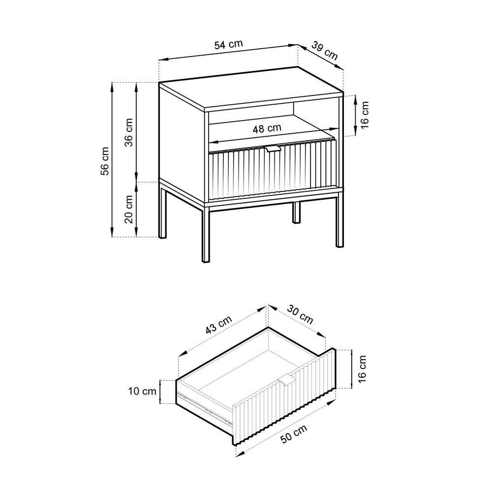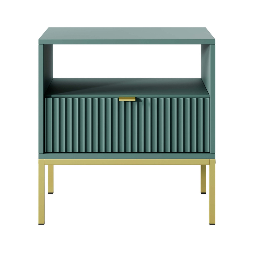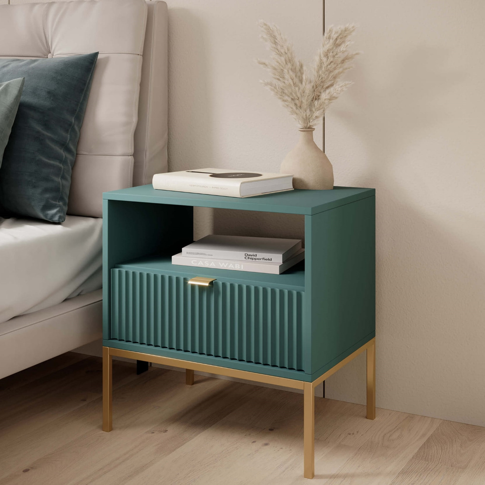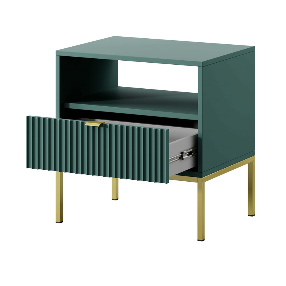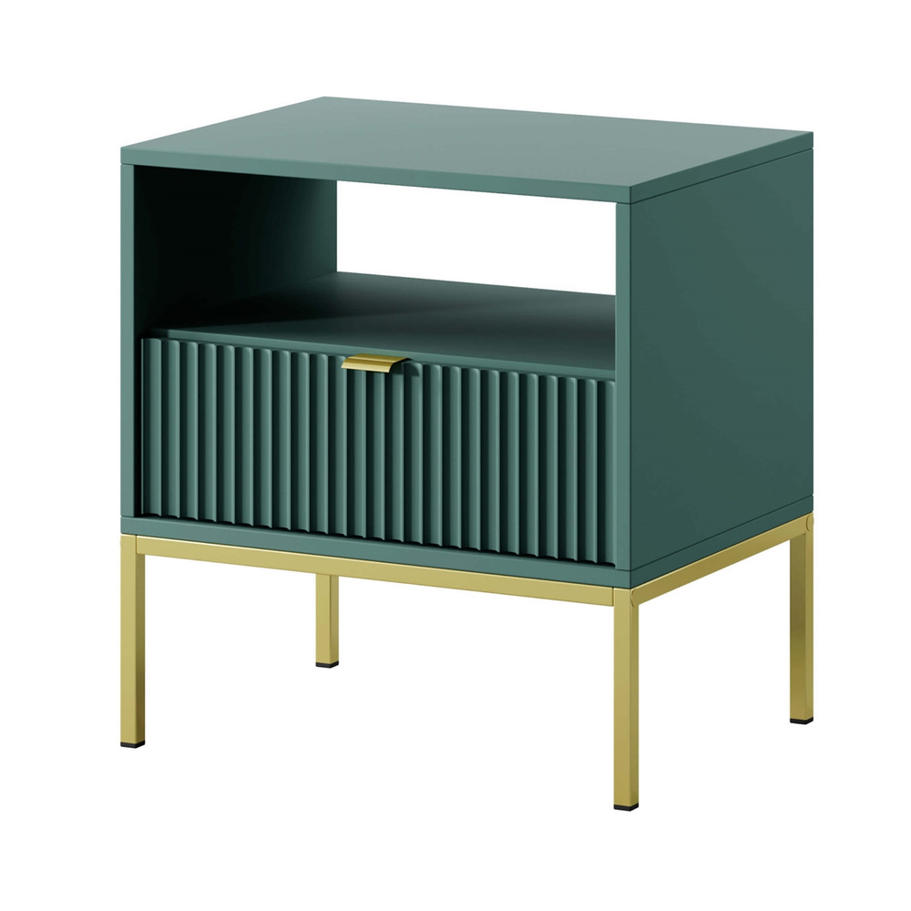 Lille sengebord VOLARE er ikke kun en fryd for øjet, men også meget praktisk - det kan opbevare din yndlingsbog, placere en natlampe på den eller lægge din telefon væk. Skabet er udstyret med en rummelig skuffe, hvor du nemt kan opbevare småting, såsom smykker eller kosmetik, som du bruger inden du går i seng. Den stabile struktur er garanteret af slanke, pulverlakerede metalben, som tilføjer elegance til helheden. Designet af Volare sengebordet vil helt sikkert glæde dit øje. Kroppen er lavet af massiv MDF, så møblet vil tjene dig i mange år. Hvis du værdsætter minimalisme og funktionalitet frem for alt andet i møbler, vil vores Volare møbelkollektion være et forslag, du bestemt ikke vil gå forbi ligegyldigt! Natbordet imponerer med sin smukke, elegante nuance af flaskegrøn og dekorativ front. Volare-kollektionen er helt anderledes end de tidligere, du måske har set på vores hjemmeside. Den er designet til at passe til nutidens trends - høje, gyldne ben, geometrisk form og farve understreger elegance og moderne stil. Det minimalistiske gyldne håndtag giver møblet ekstra værdi og øger indretningens prestige. Dette er modulopbyggede møbler, så de kan kombineres frit. Der er ikke noget simpelt mønster til disse møbler - de passer overalt, hvor du ser dem.