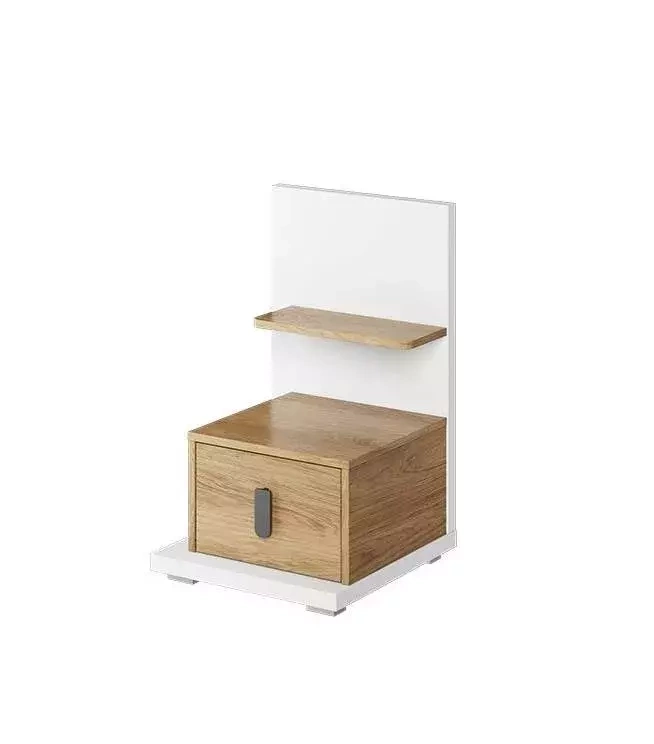 Det originale design og varme farve på SIMI natbordet vil subtilt dekorere dit soveværelse. Den hvide krop kombineret med en let træindretning blødgør stemningen i rummet og virker beroligende på dit velvære efter en hård dag udenfor hjemmet. En rummelig skuffe og to hylder giver dig mulighed for at opbevare de nødvendige ting ved siden af sengen, såsom creme, en bog eller et vækkeur. Du kan også frit lægge din telefon på bordet inden du går i seng. Slidstærke ben giver skabet stabilitet, og det hule materiale gør det modstandsdygtigt over for belastninger. Vores produkt kombinerer modernitet og alsidighed, hvilket helt sikkert vil tiltrække dine gæsters opmærksomhed!