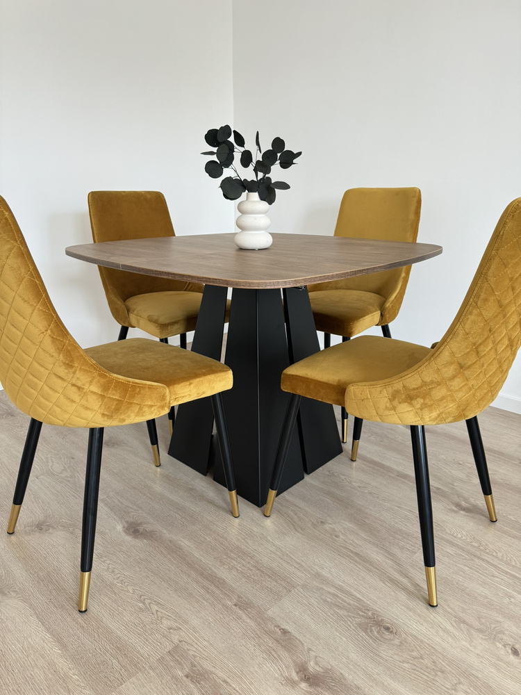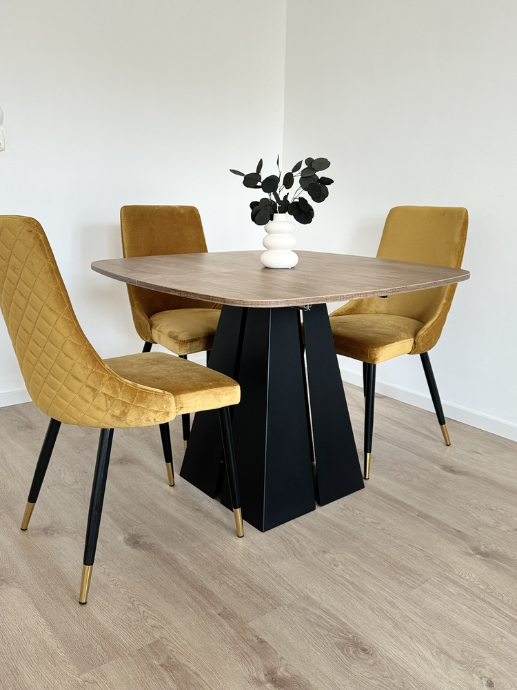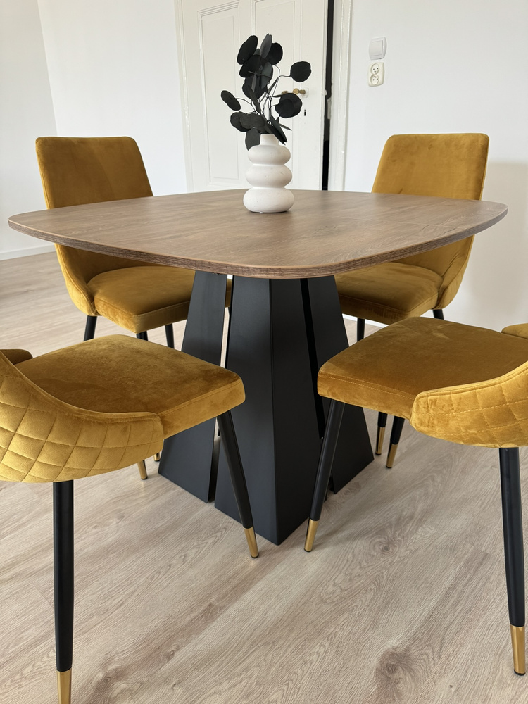 Spisebordets bund består af fire geometriske ben lavet af sort metal. Benene er præcist pulverlakerede, hvilket ikke kun sikrer stabilitet og holdbarhed, men også beriger helheden med en moderne accent. Deres matte finish står i perfekt kontrast til den laminerede bordplade, hvilket skaber et ensartet og stilfuldt look, der passer til en række forskellige interiørarrangementer.