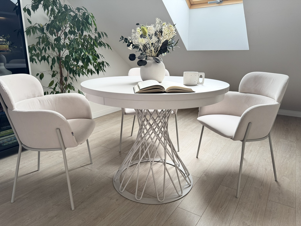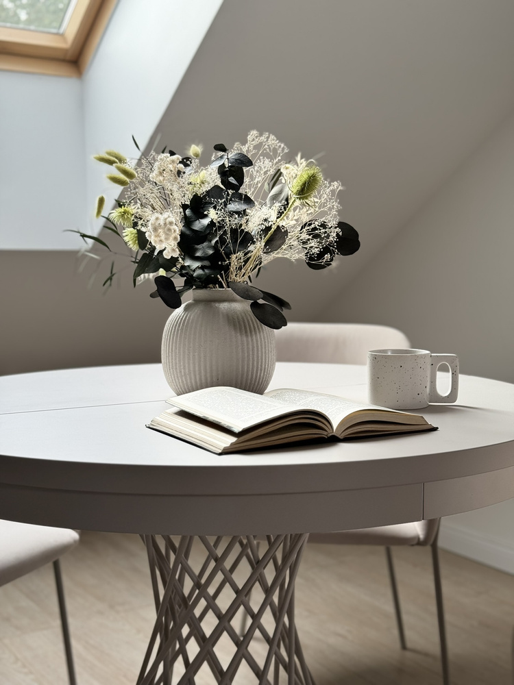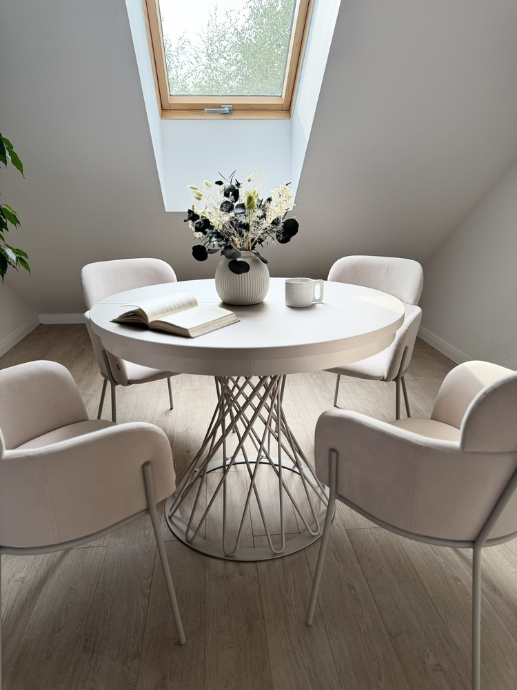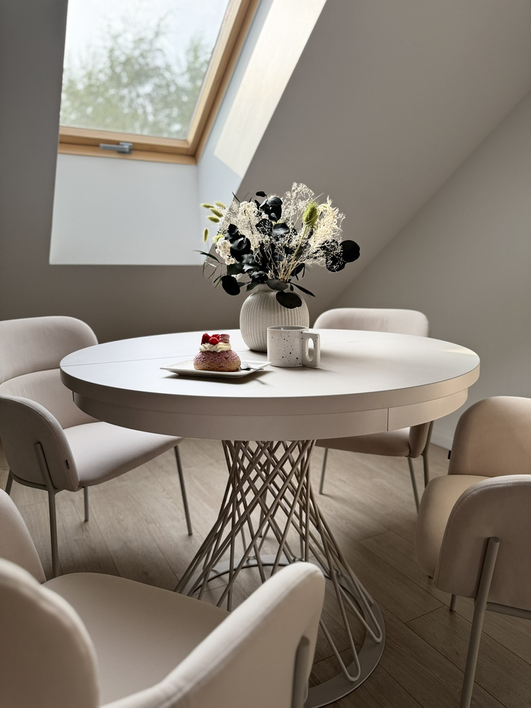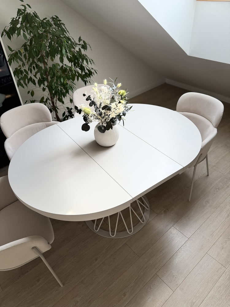 Gardino-bordet 100/140 cm er et møbel, der ikke dominerer – det fuldender rummet. Den danner baggrund for hverdagens øjeblikke: morgenkaffen, eftermiddagslyset, der strømmer ind gennem vinduet, samtaler over et glas vin. Den runde bordplade er behagelig, og muligheden for at udvide den til 140 cm gør, at du nemt kan få plads til flere personer, når du har brug for det.