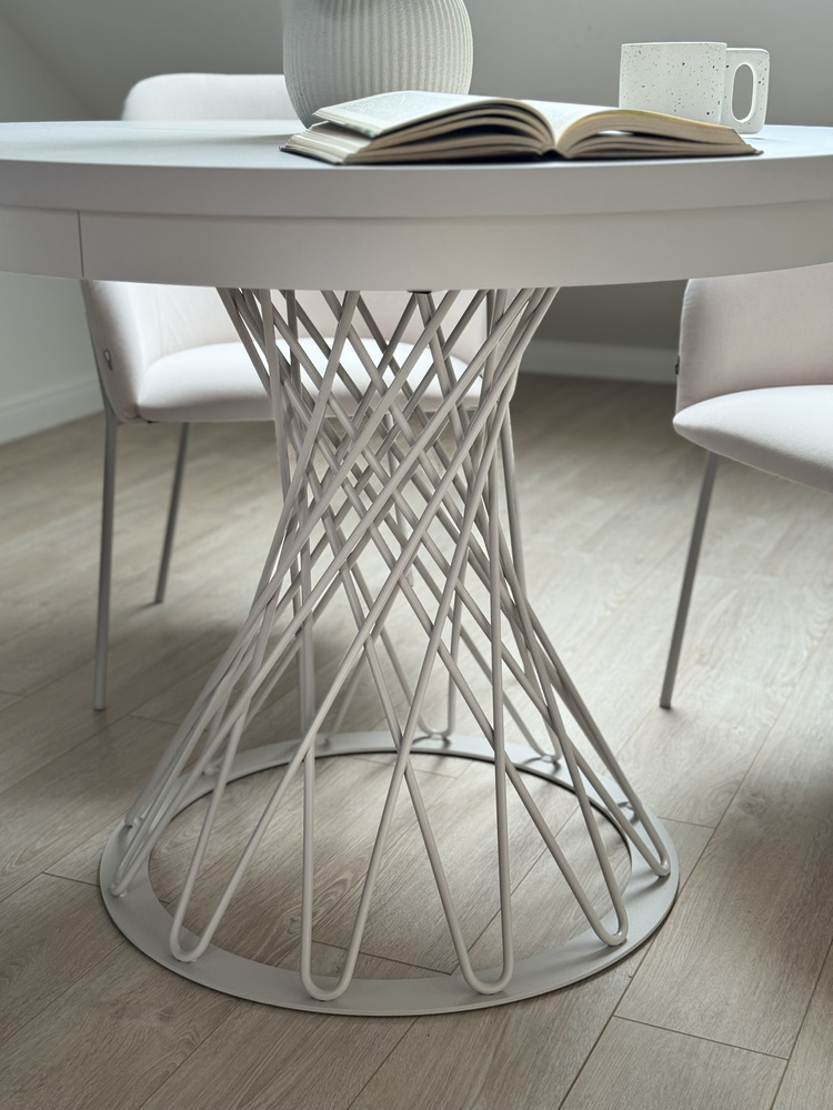 Den åbne base i kashmirfarve minder om en blød, skulpturel struktur – let, men stabil. Den giver interiøret et unikt præg, især i kombination med lyse stole eller naturlige tilbehør i træ, hør og keramik. Det hele fremstår meget stilfuldt og elegant.
