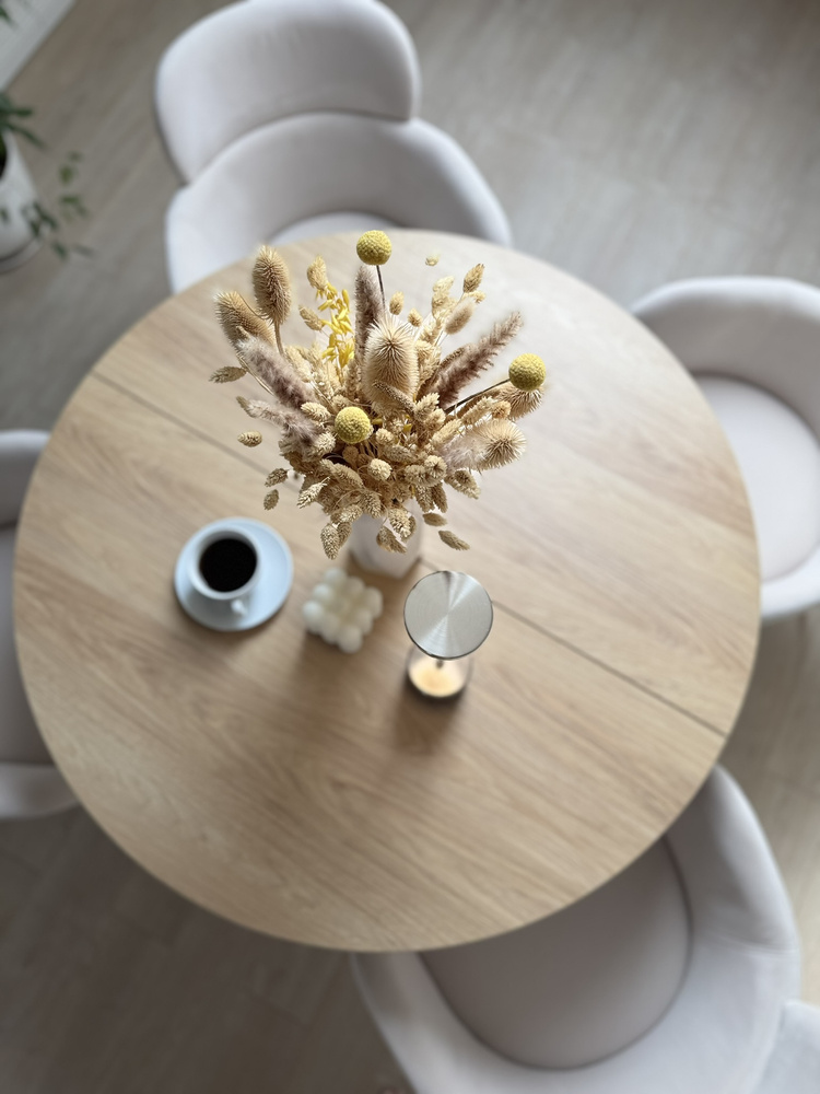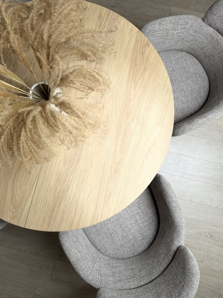 GARDINO-bordet er en kombination af elegance, modernitet og funktionalitet, der skaber et møbel, der tiltrækker opmærksomhed i ethvert interiør. I sammenklappet version er det velegnet til 4 personer, og takket være udtræksfunktionen kan du hurtigt gøre plads til et møde i større selskab. Den runde bordplade med en diameter på 100 cm er lavet af holdbar laminatplade i naturlig eg og er ikke kun modstandsdygtig over for daglig brug, men også nem at vedligeholde. En yderligere fordel er, at du på få minutter nemt kan udvide den fra 100 cm til 140 cm ved at montere en ekstra indsats.