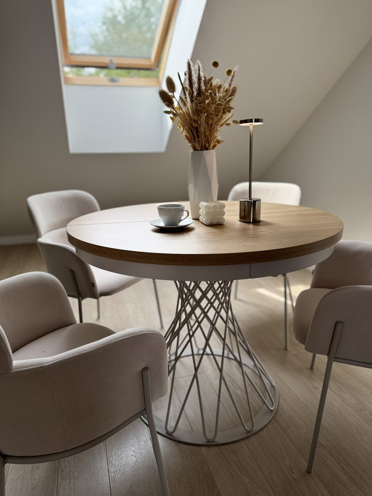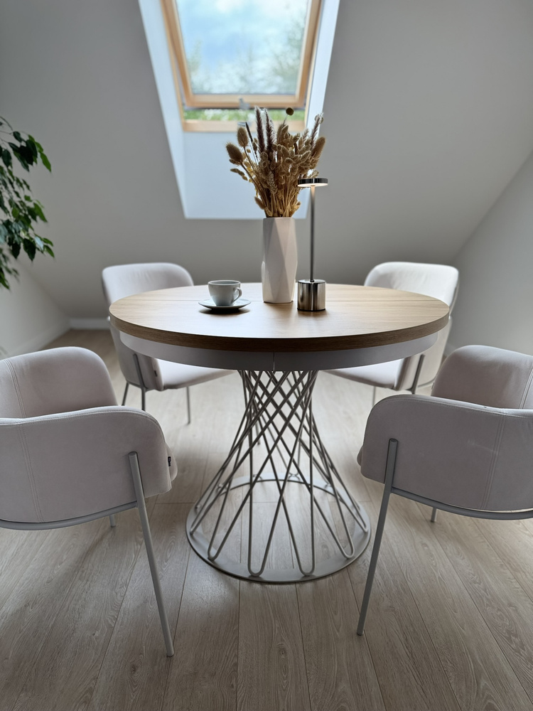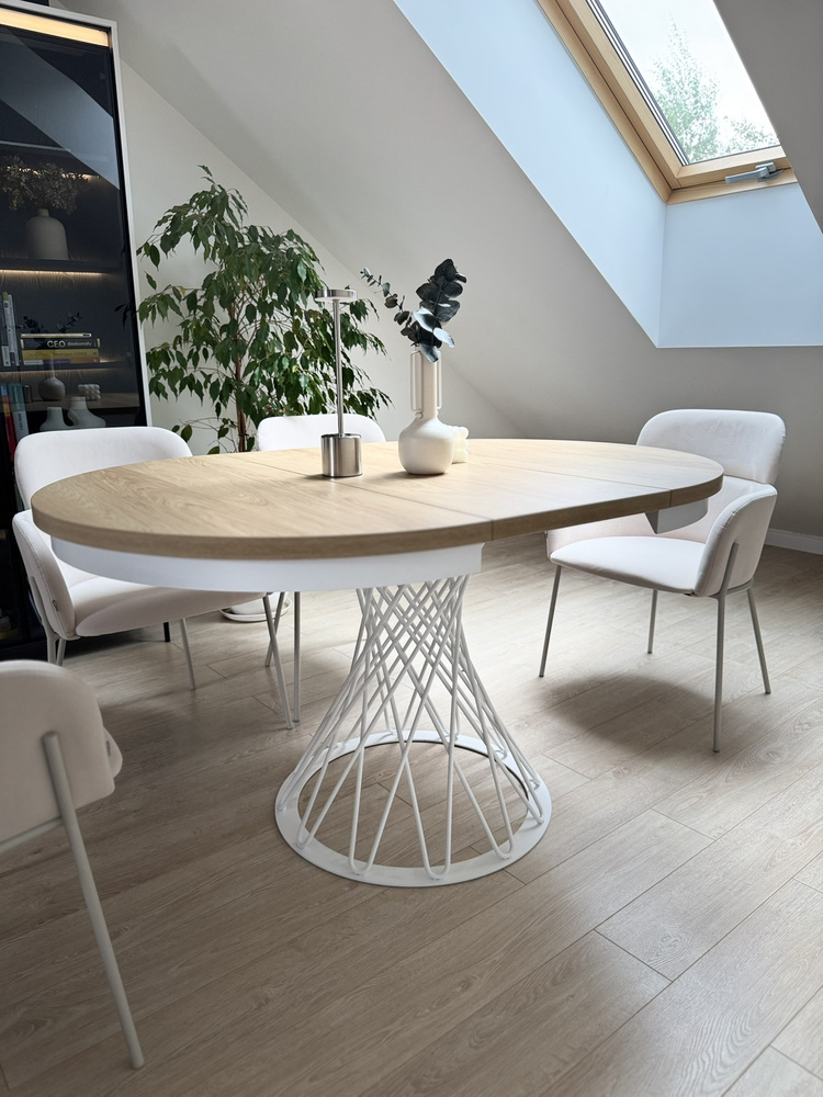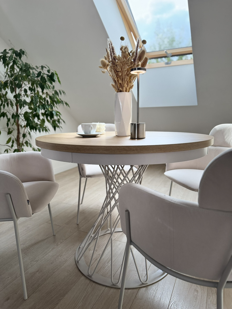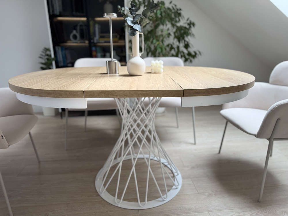 Gardino-bordet 100/140 cm er et unikt møbel, der kombinerer moderne design med loft-lethed. Den runde bordplade i naturlig eg kan udvides til 140 cm, hvilket gør den til det perfekte valg til hverdagen og til særlige lejligheder. Den åbne, hvide metalfod giver den lethed og en unik stil. GARDINO passer perfekt til lyse, hyggelige interiører – både i spisestuen og i stuen.