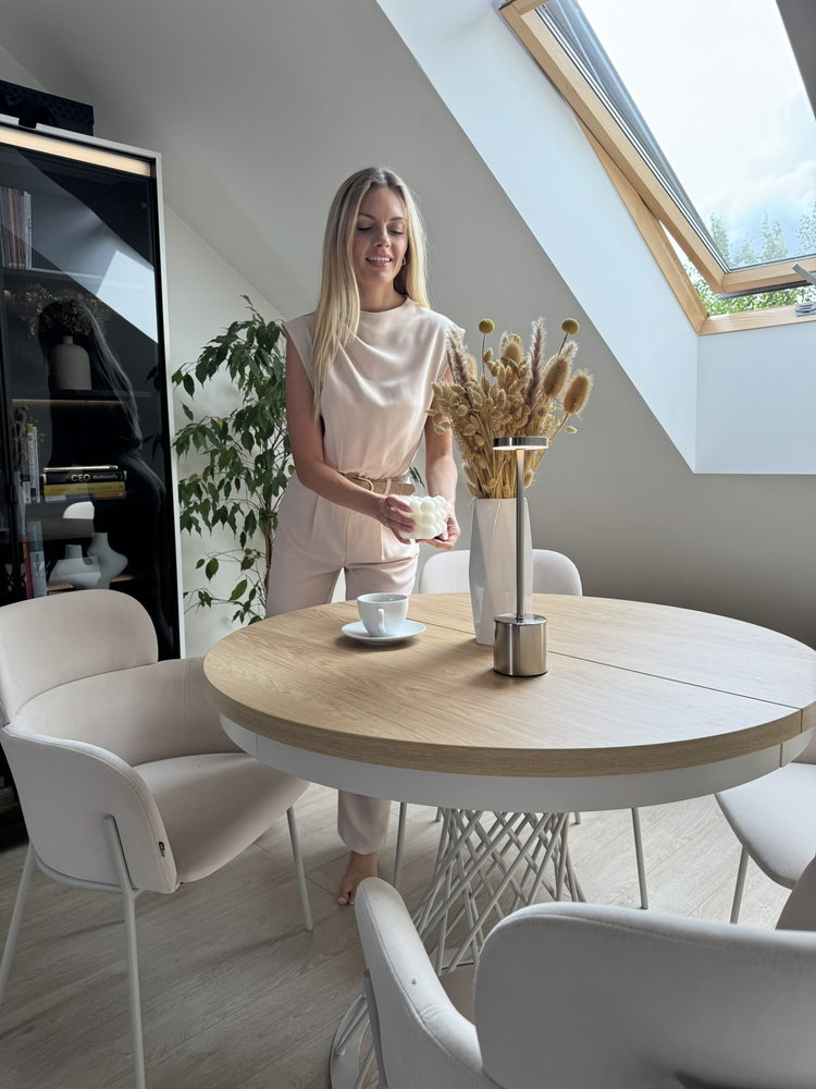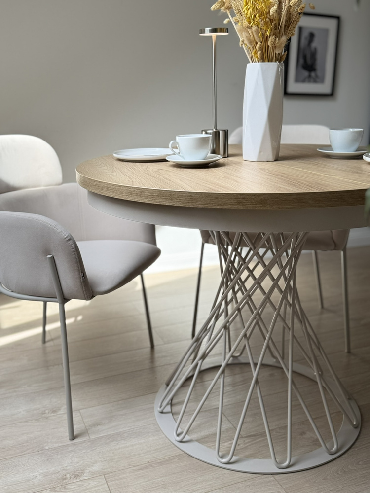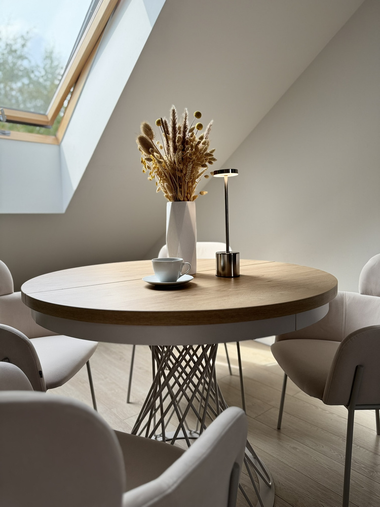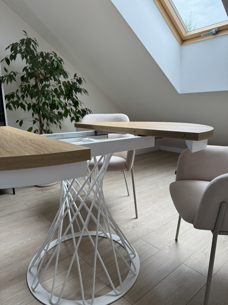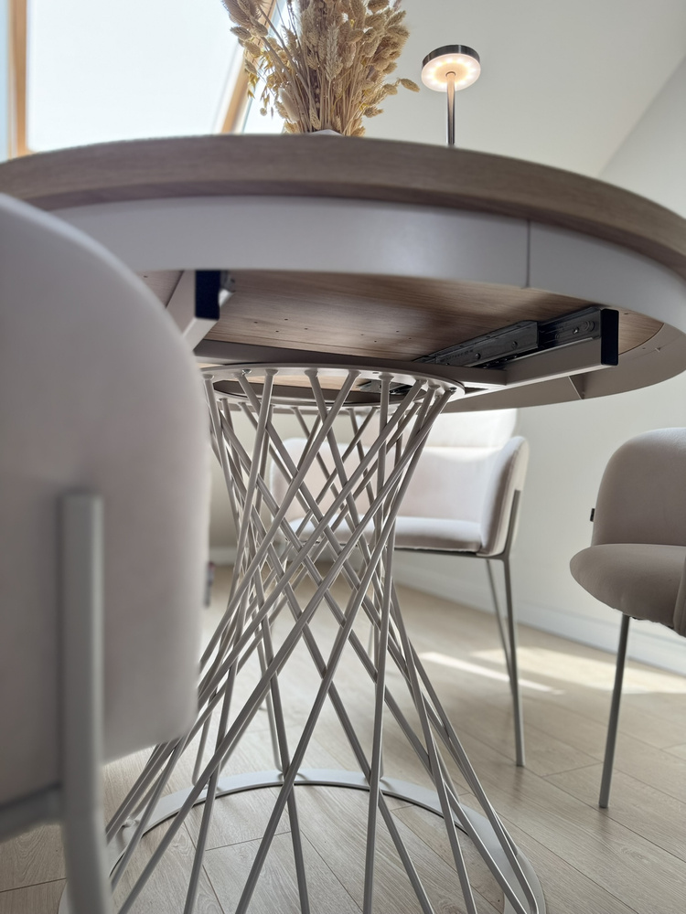 Gardino-bordet 100/140 cm er et unikt møbel, der kombinerer moderne design med loft-lethed. Den runde bordplade i naturlig eg kan udvides til 140 cm, hvilket gør den til det perfekte valg til hverdagen og til særlige lejligheder. Den åbne, hvide metalfod giver den lethed og en unik stil. GARDINO passer perfekt til lyse, hyggelige interiører – både i spisestuen og i stuen.
