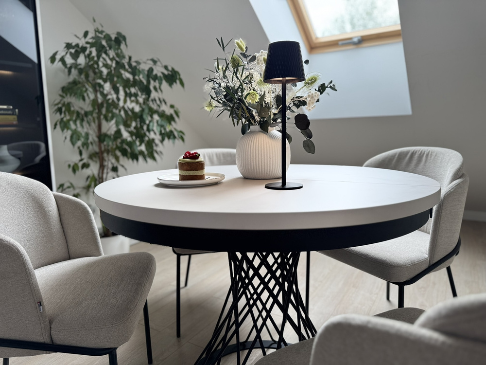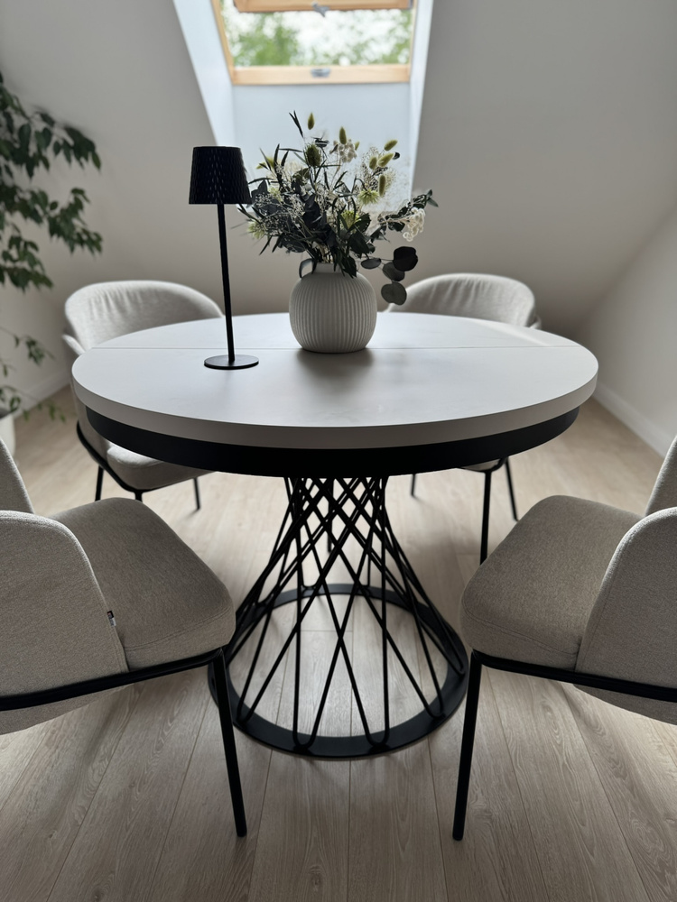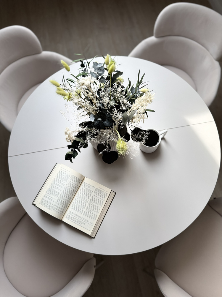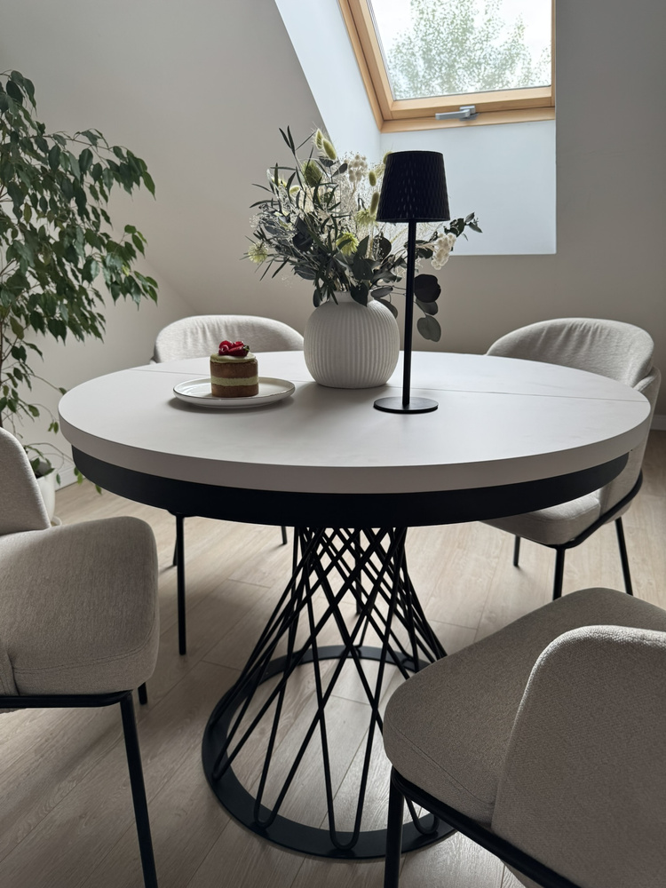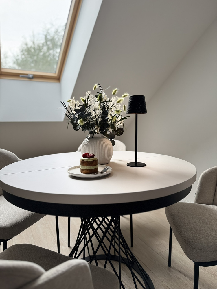 Forestil dig en aften ved stearinlys. En vase med en minimalistisk komposition, stille musik i baggrunden, en kop te. Dette bord bliver baggrunden for dine ritualer – om morgenen og om aftenen. Når gæsterne kommer, er det nok med et enkelt håndgreb, og den runde bordplade kan udvides til 140 cm, så der nemt er plads til 6 personer. Og til daglig brug? Den tager ikke meget plads og passer perfekt ind i stuen, spisestuen eller det moderne køkken.