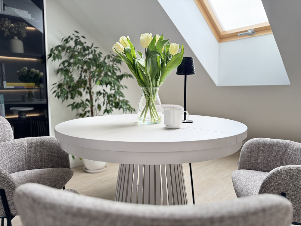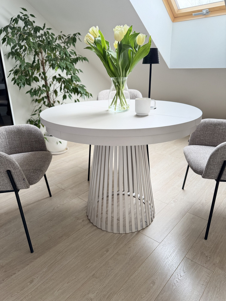 Det hvide spisebord står på et metalben med et unikt design. På afstand minder basen om de lister, der i øjeblikket er et hit i indretningen. Kombinationen af metal og massiv laminatplade har skabt et møbel, der helt sikkert vil skille sig ud i rummet. Dette alsidige møbel er perfekt til mange designstilarter - fra minimalistisk til industriel. Den massive plade kombineret med den moderne metalbase skaber en elegant kombination, der kan blive omdrejningspunktet i et rum. En særlig styrke ved bordet er dets ekstraordinære stabilitet. Det overordnede look er meget stilfuldt og elegant.