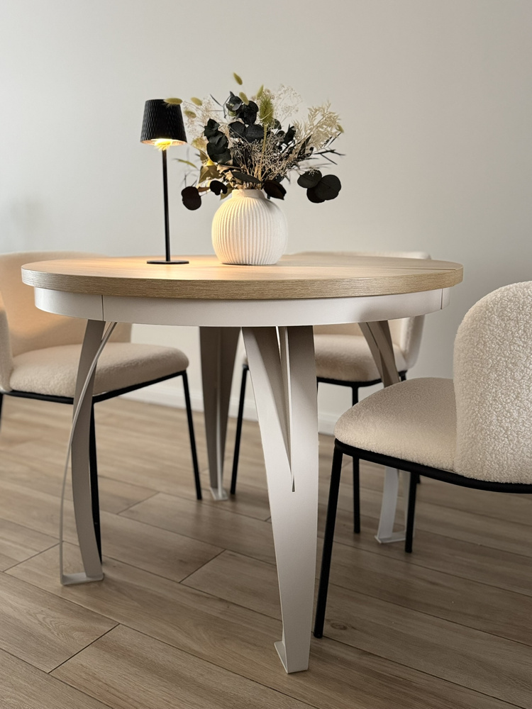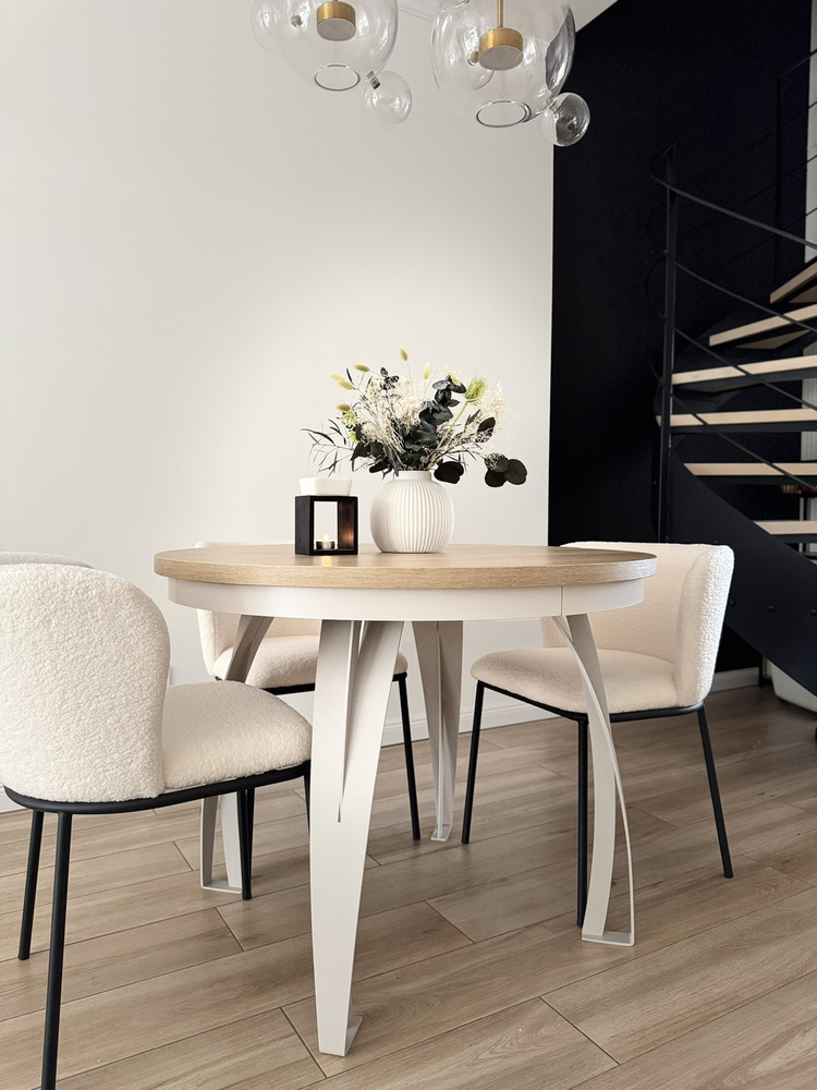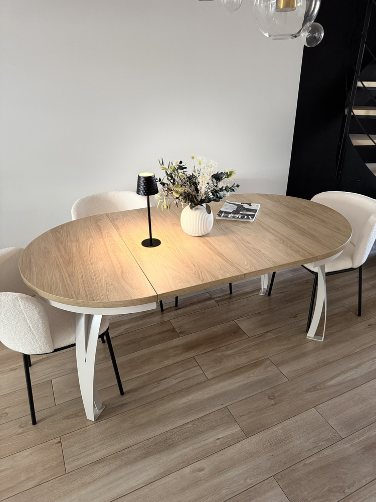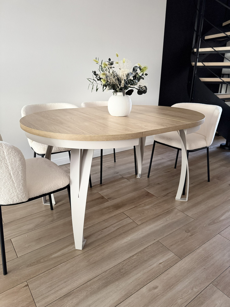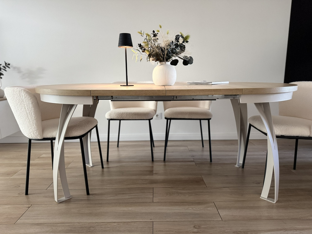 Det udtrækkelige bord BUENO er med sine beskedne dimensioner perfekt til en lille spisestue, køkken eller stue. På få minutter kan du nemt udvide den fra 100 cm til 140 eller endda 180 cm ved at montere ekstra indsatser. Så behøver du ikke bekymre dig om, hvor du skal placere dine gæster. Denne model er udstyret med en stilfuld ramme under bordpladen, der dækker skinnerne og giver et æstetisk og elegant udseende.