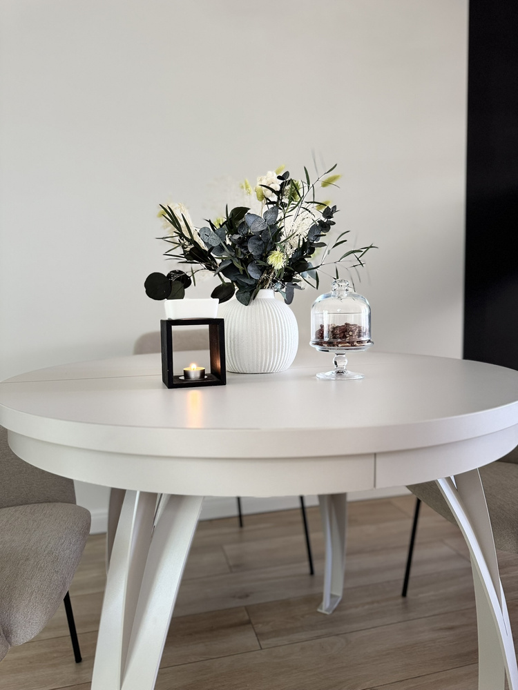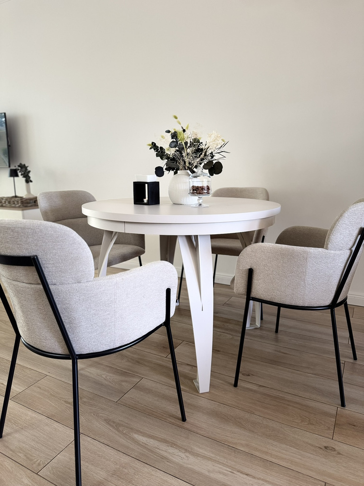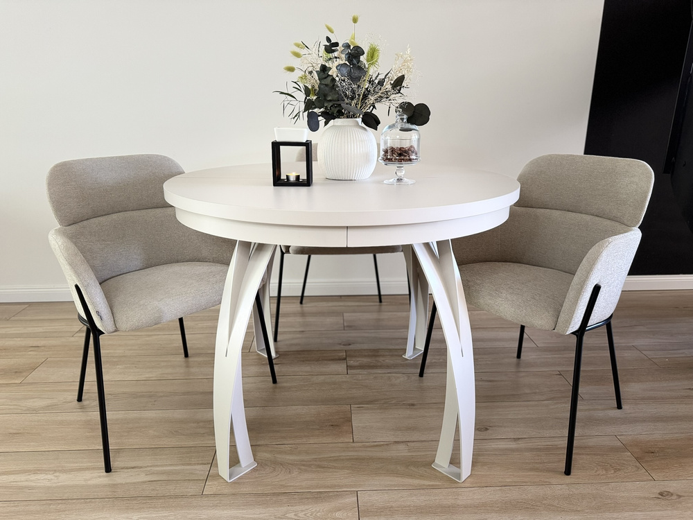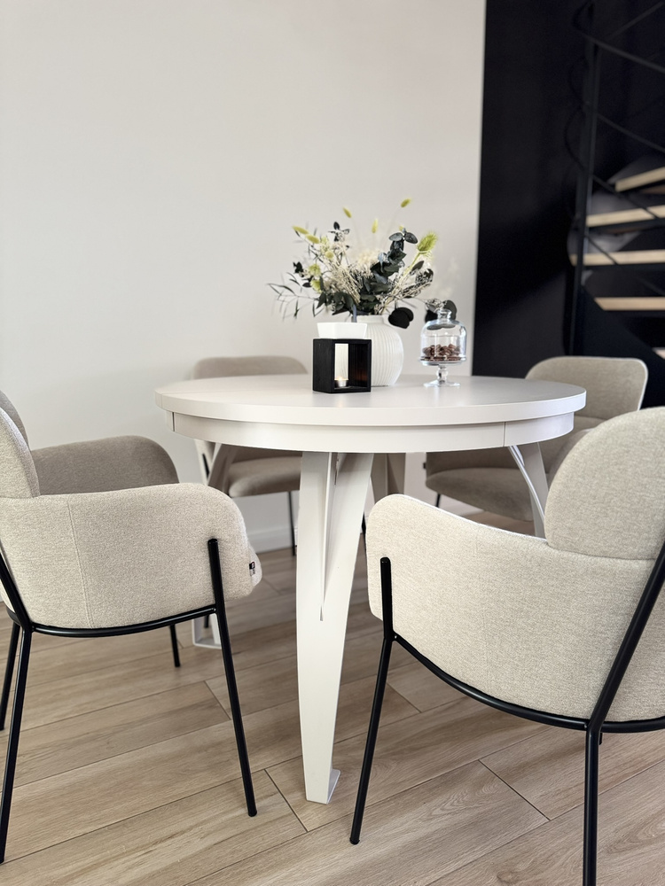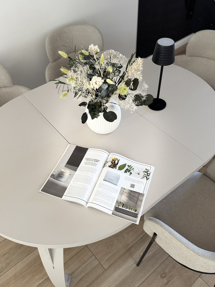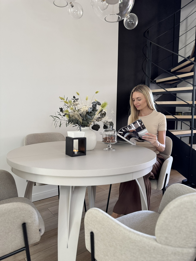 Det er et møbel, der ikke dominerer – det fuldender rummet. Det skaber baggrund for hverdagens øjeblikke: morgenkaffen, eftermiddagslyset, der strømmer ind gennem vinduet, samtaler over et glas vin. Den runde bordplade er behagelig og åben, og muligheden for at udvide den til 180 cm gør, at du nemt kan få plads til flere personer, når du har brug for det.