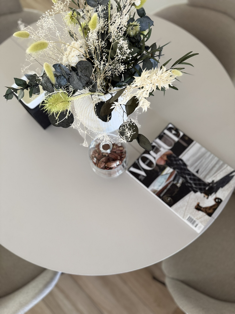Bueno-bordet er et godt valg for dem, der værdsætter ro, harmoni og subtilitet i designet. Det er holdt helt i den moderigtige farve kashmir – en varm, elegant beige med et strejf af gråt – og passer perfekt ind i interiører, der skal give ro.