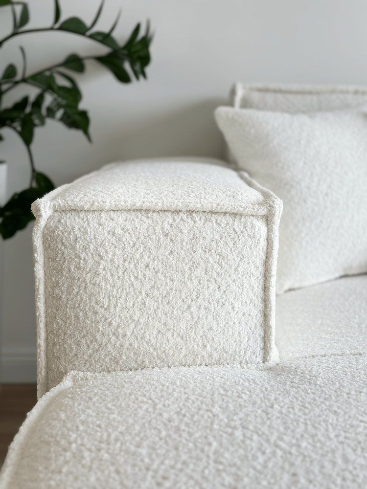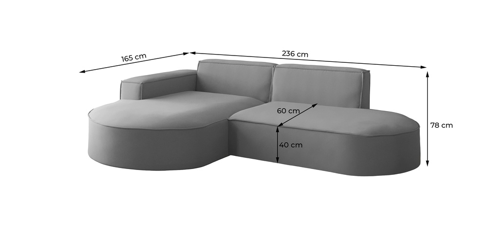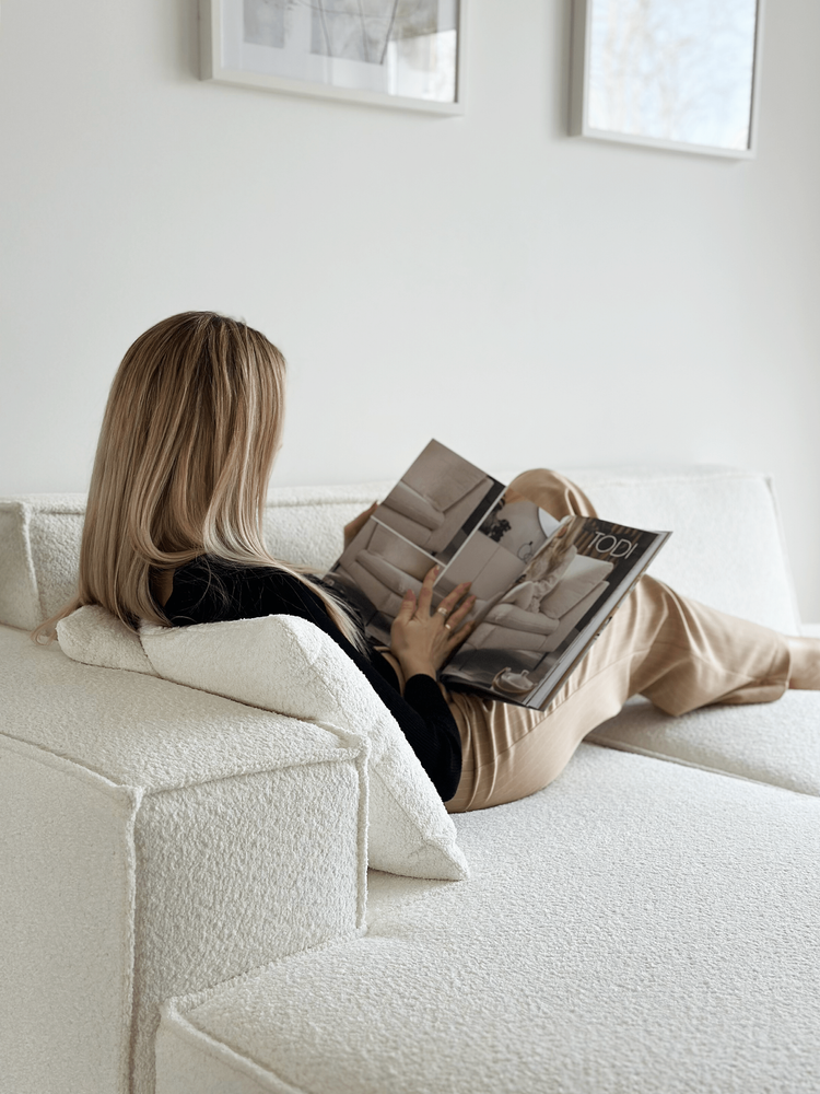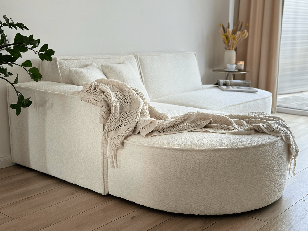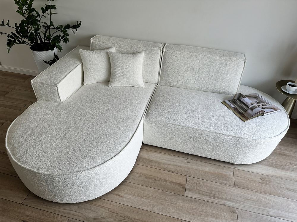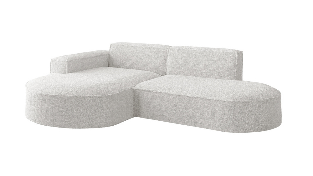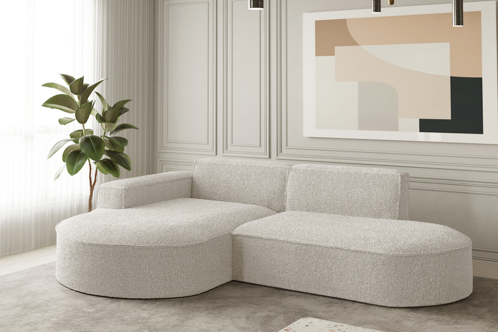 Denne unikke hjørnesofa til stuen er en fantastisk måde at skabe et rum til afslapning i rummet på. Det brede sæde på denne hjørnesofa er fyldt med polyurethanskum af højeste kvalitet og bølgefjedre, og ryglænet er usædvanligt blødt, som vil omslutte din krop og hjælpe dig med at slappe af. Alle afrundede kanter skaber et blødt og hyggeligt indtryk. Der blev brugt et boucle-stof, som lignede lammepels. Dette er et meget moderigtigt materiale, der bliver mere og mere populært hos kunderne. Dette stof har en meget interessant vævning, som ligner en kombination af flere løkker. Takket være dette ser det meget elegant og originalt ud og er også ekstremt holdbart. Bagsiden af hjørnesofaen er desuden beklædt med stof, hvilket betyder, at den kan placeres hvor som helst i stuen.