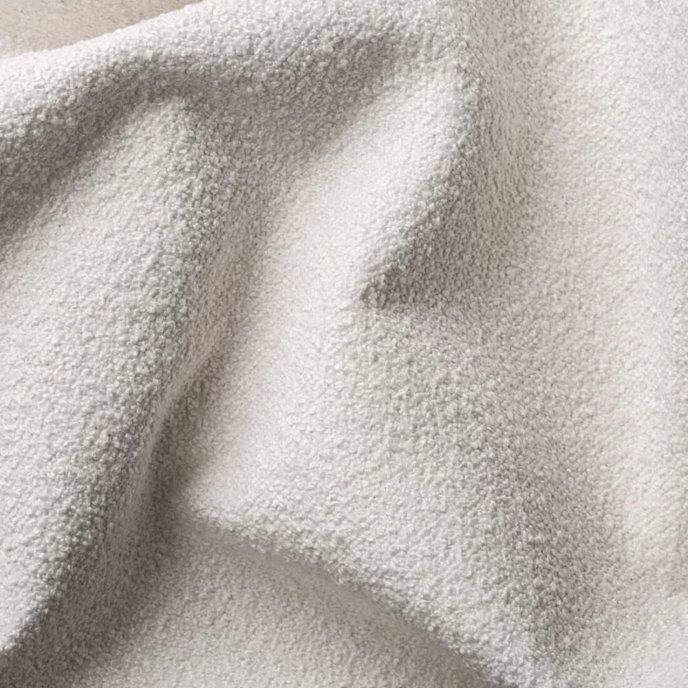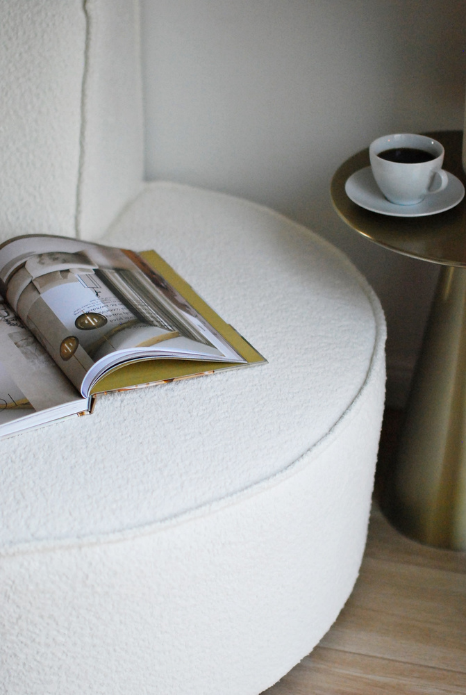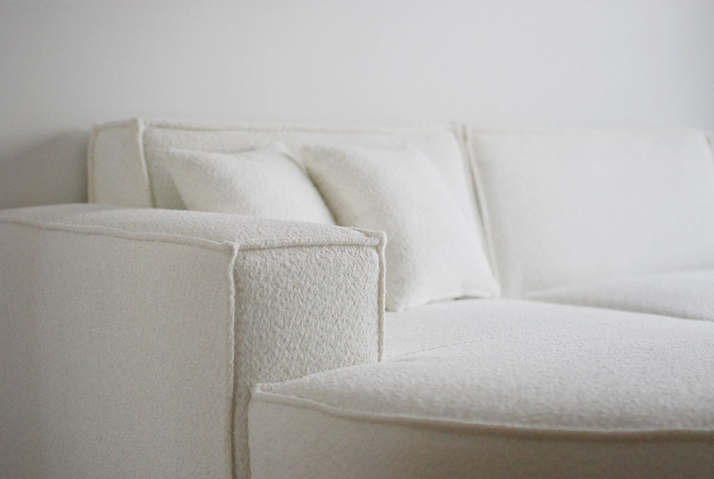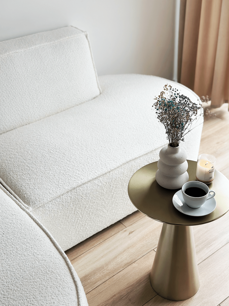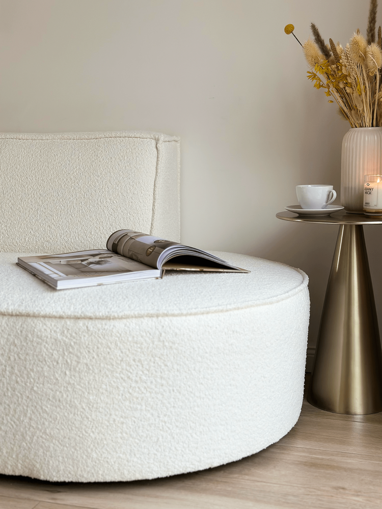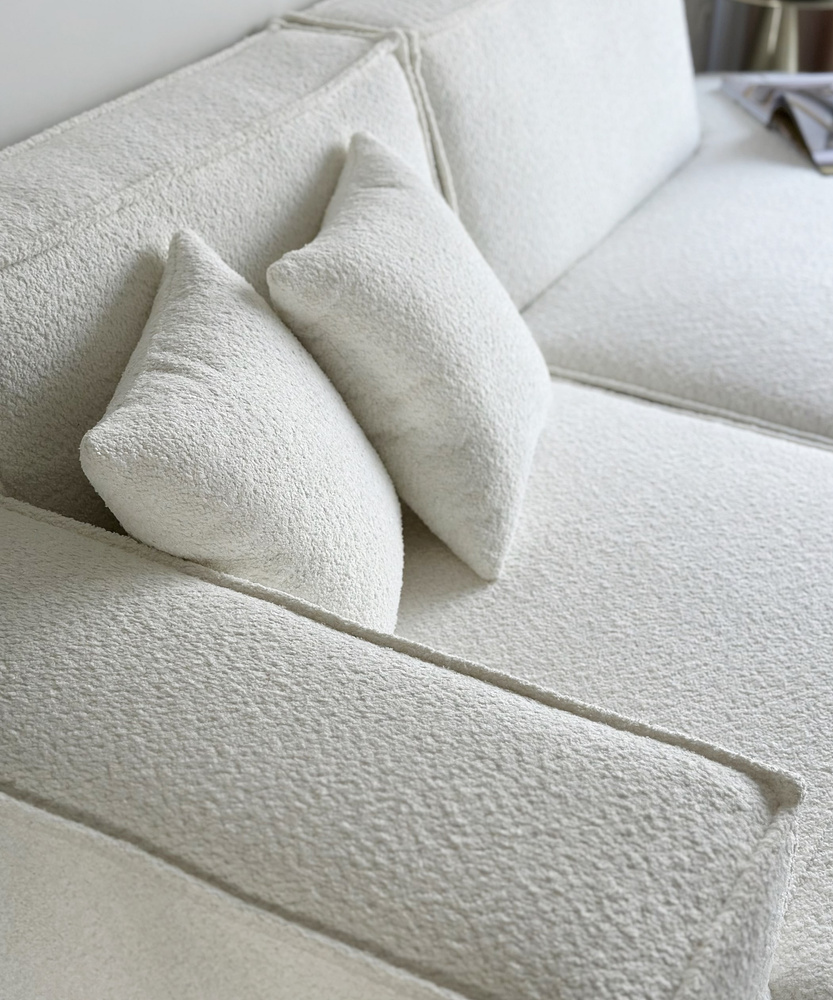 Denne unikke hjørnesofa til stuen er en fantastisk måde at skabe et rum til afslapning i rummet på. Det brede sæde på denne hjørnesofa er fyldt med polyurethanskum af højeste kvalitet og bølgefjedre, og ryglænet er usædvanligt blødt, som vil omslutte din krop og hjælpe dig med at slappe af. Alle afrundede kanter skaber et blødt og hyggeligt indtryk. Der blev brugt et boucle-stof, som lignede lammepels. Dette er et meget moderigtigt materiale, der bliver mere og mere populært hos kunderne. Dette stof har en meget interessant vævning, som ligner en kombination af flere løkker. Takket være dette ser det meget elegant og originalt ud og er også ekstremt holdbart. Bagsiden af hjørnesofaen er desuden beklædt med stof, hvilket betyder, at den kan placeres hvor som helst i stuen.