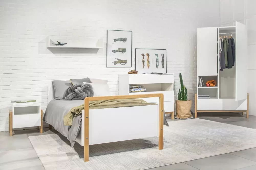VICTOR væghylde er et produkt designet som et element, der komplementerer VICTOR møbelkollektionen. Den beskrevne hængehylde er lavet af en certificeret hvid lamineret møbelplade. Pladen er 18 mm tyk, hvilket gør hylden holdbar og stærk. De hævede sider af VICTOR-hylden giver dig mulighed for at placere bøger på den uden at frygte, at de falder ned af hylden. En væghylde i et børneværelse er ikke kun en ekstra opbevaringsplads, men også en dekoration.