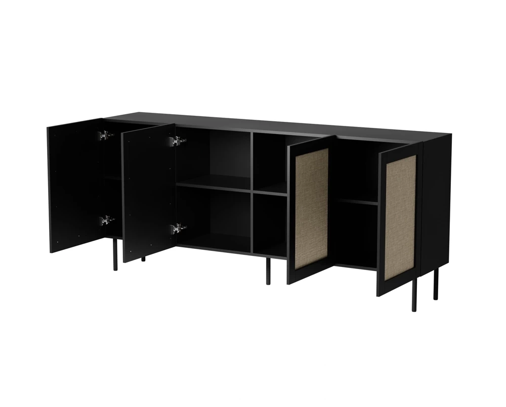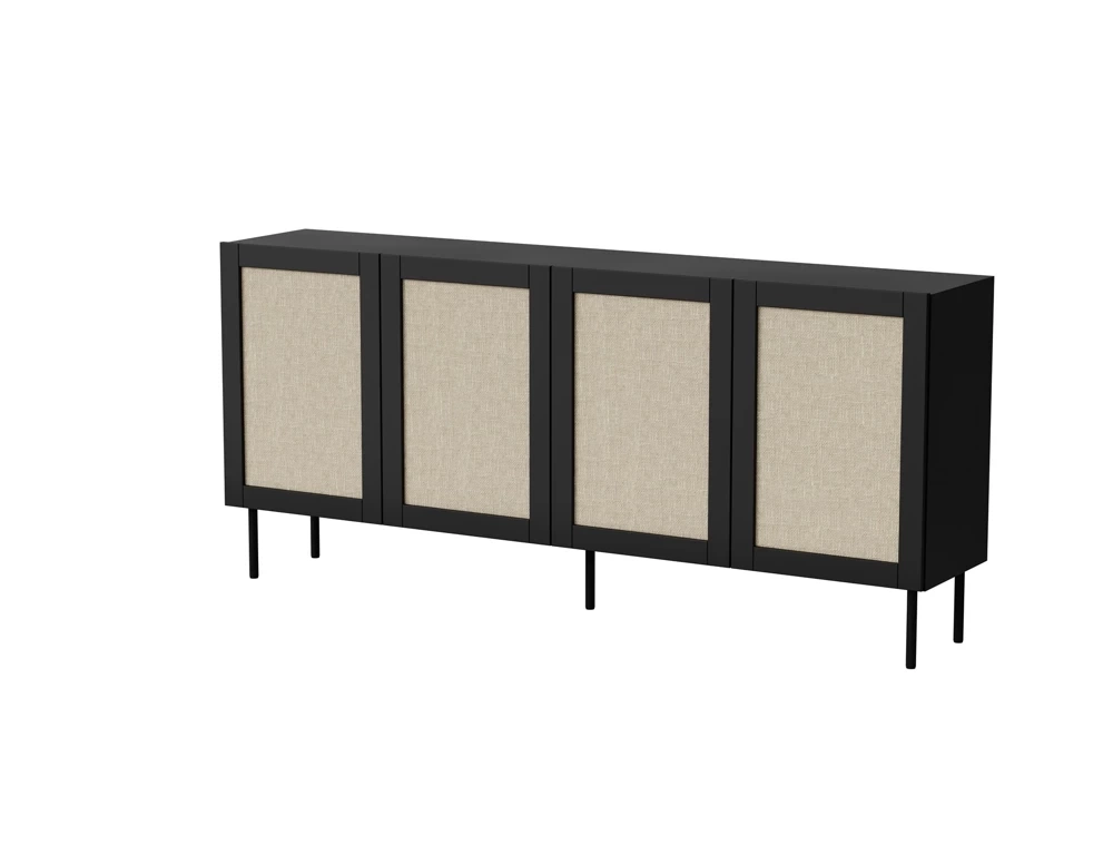 Fire-dørs kommode BAGGIO vil være perfekt til et rustikt interiør. Det unikke look vil fylde din stue med varme og tiltrække dine gæsters opmærksomhed. Møblerne har fire fronter, bag hvilke vi har otte rummelige hylder, hvor vi kan opbevare vores yndlingsbøger, en samling film eller brætspil. Vi kan vise flotte dekorationer på bordpladen omgivet af smukke blomster, der passer perfekt til helheden. Den sorte kommode har ingen greb, fronterne er lidt forlængede, så den let kan åbnes. De sorte metalben, som er høje nok til at gøre det nemmere at holde orden under møblerne, tilføjer subtilitet og stabilitet til kommoden. Kommodens krop er lavet af en 16 mm mat MDF plade, og indsatsen er lavet af PP folie LINOL CALABRIA.