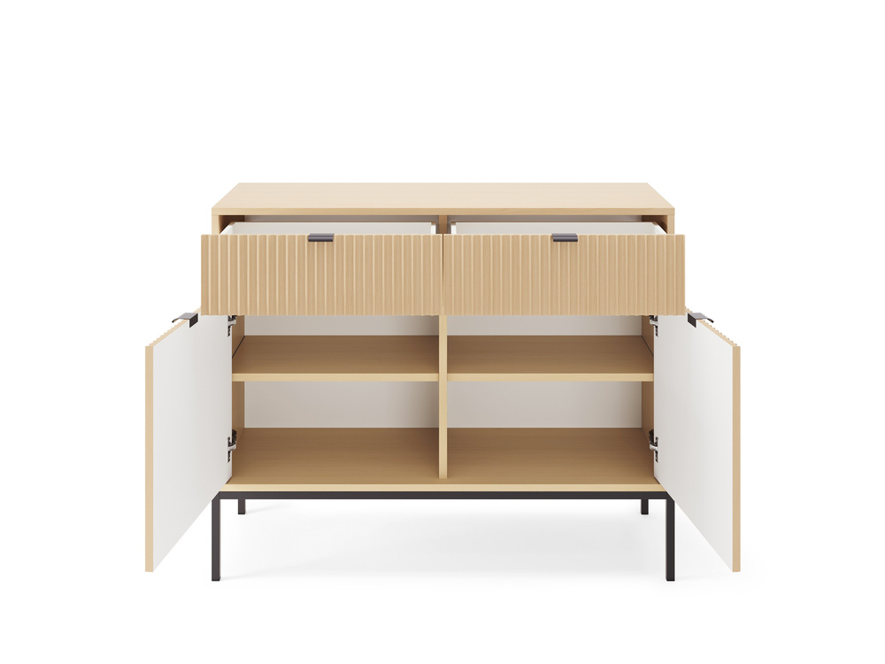 VOLARE kommoden med to låger er et moderne tilbud til sofistikerede brugere. Den har et par låger med rummelige hylder bagved. Her kan du nemt ordne store og små ting, uden problemer med at holde værelset pænt. To skuffer vil være perfekte som opbevaringsplads til tilbehør, undertøj eller andre småting, som du altid gerne vil have lige ved hånden. Møbelkollektionen Volare skiller sig ud fra lignende forslag med et moderigtigt design, hvor hoveddekorationen er en rillet front og en geometrisk base. Det er takket være dem, at møblerne ser ekstremt attraktive ud, hvilket gør det muligt at placere dem ikke kun i stuen, men også i soveværelset, gangen eller gæsteværelset.