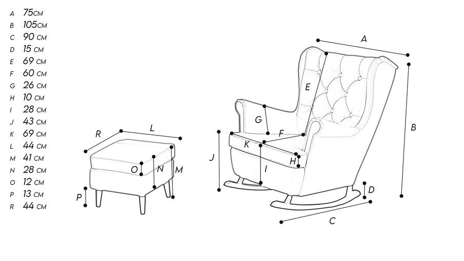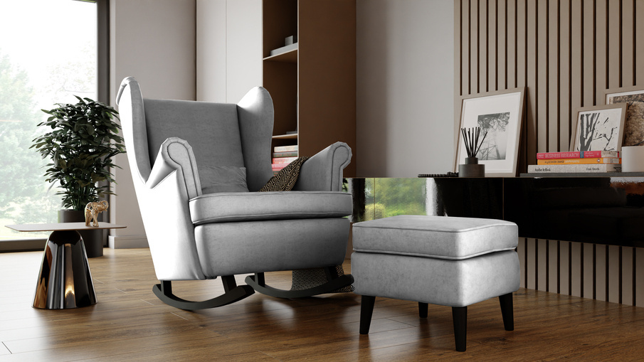 DALIA gyngestolen med fodskammel er et stilfuldt møbel, lavet specielt til folk, der elsker at slappe af i deres hjem. Wingback lænestolen udmærker sig ved sin elegante form og brugen af meget høj kvalitet stof. Det vil være en perfekt tilføjelse til dit hjem i skandinavisk stil. Den vil være perfekt i stuen som et ekstra hvilested eller i soveværelset, hvor du læser dine yndlingsbøger om aftenen. Vi er sikre på, at lænestolen også kan være et ideelt møbel til et børneværelse - at læse bøger om aftenen eller falde i søvn om natten vil være endnu mere behageligt takket være lænestolens vippefunktion. En yderligere fordel ved fodstøtten er muligheden for at åbne den og gemme småting som aviser eller bøger indeni. Den stilrene lænestol med fodskammel er lavet af Monolith stof, som er et glat og elegant møbelmateriale. Den er slidstærk og vandtæt, hvilket gør det meget nemmere at vaske snavs fra stoffets overflade. Dalia lænestolen er designet med fokus på detaljer, så den vil tjene os i mange år. Strukturen er lavet af spånplader, mens løbere og ben er lavet af bøgetræ. Bølgefjedrene og HR-skummet i stolen og fodstøtten gør den meget behagelig at sidde i.